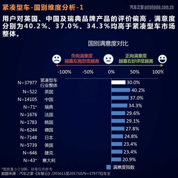● 紧凑型车正面评价偏多,主流海外品牌满意度低于平均水平