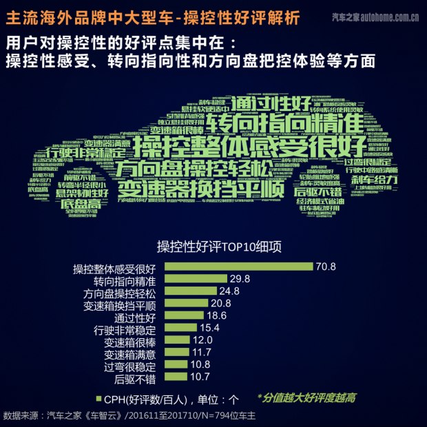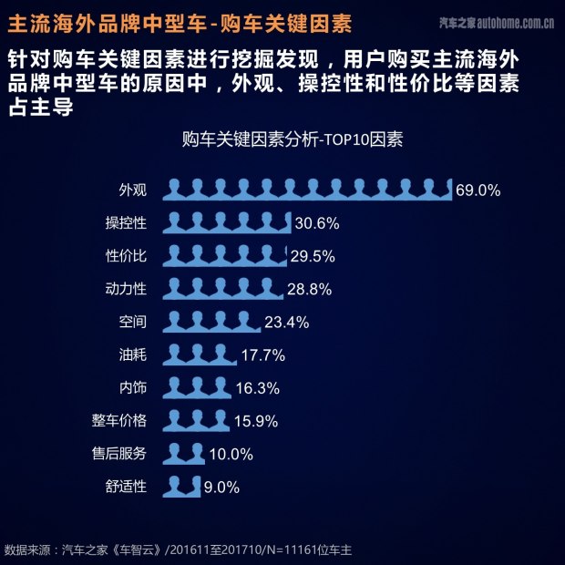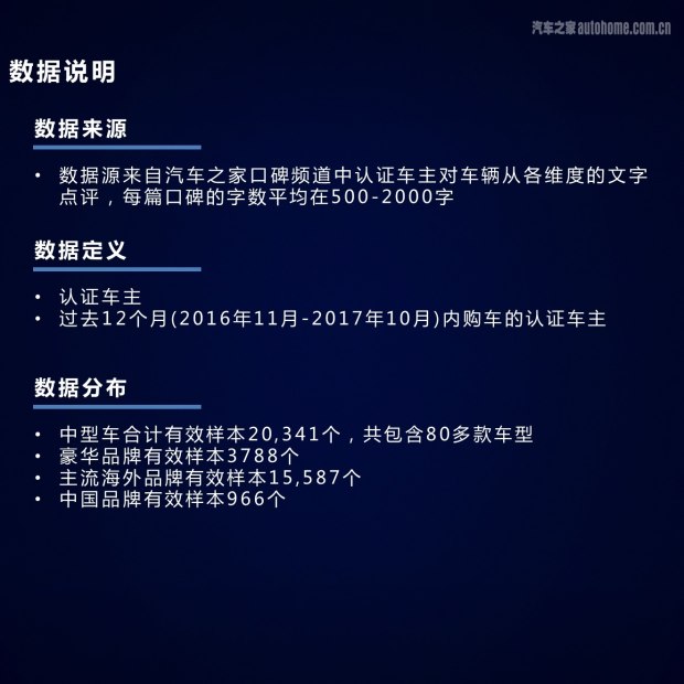 我们的数据来源是汽车之家的真实车主,他们在过去的12个月中(2016年11月-2017年10月)购买了新车并获得了汽车之家认证。在用户数量方面,我们收到了包括80多款车型的20341个有效样本,其中中国品牌的有效样本数量为966个,豪华品牌的有效样本数量为3788个,主流海外品牌有效样本数量为15587个。