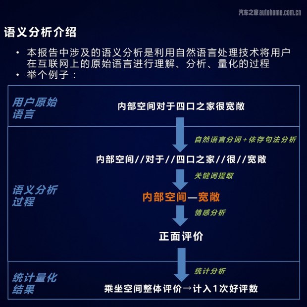在制作《2017年新车车主评价报告》的过程中,我们使用了语义分析技术,将真实车主对于车型的文字评价转化为数据进行统计分析。比如上图中车主的评价“内部空间对于四口之家很宽敞”,通过该技术可以做出“内部空间-宽敞”的情感分析,进而计入一次好评数,最终转化成数据。