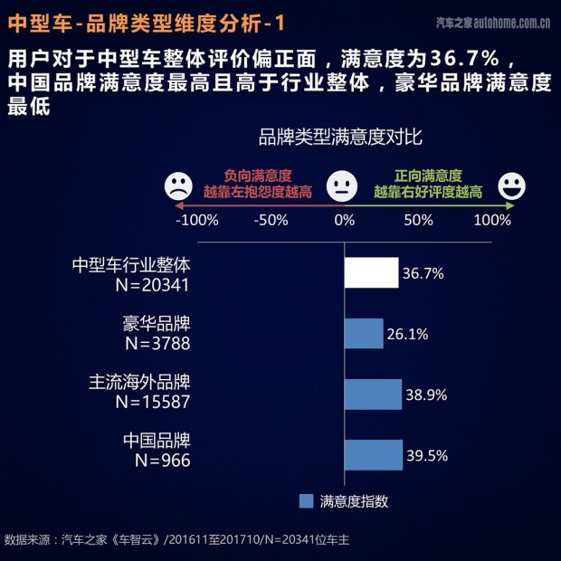 通过上文的介绍,相信大家对于《汽车之家2017年新车车主评价报告》的评价体系已经有了一定的认识,那么咱们接下来就进入正题,看看按照品牌类型、品牌国别、价格区间、配置需求、购车关键因素等几个维度,车主们对于中型车都做出了怎样的评价吧!