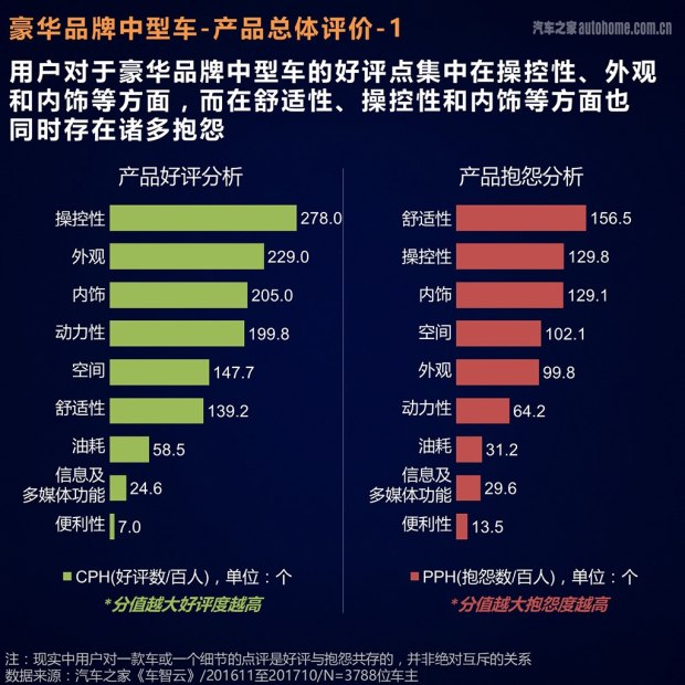 通过上文,相信大家对于《汽车之家2017年新车车主评价报告》的评价体系有了一定的认识,那么咱们就进入正题,首先看看中大型车在各个方面的表现吧。