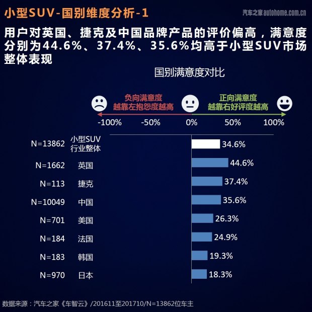 我们的数据来源是汽车之家的真实车主,他们在过去的12个月中(2016年11月-2017年10月)购买了新车。在用户数量方面,以小型SUV为例,我们共收到了13862个有效样本,包含了60多款车型。其中中国品牌的有效样本数量为11711个,主流海外品牌有效样本数量为2151个。