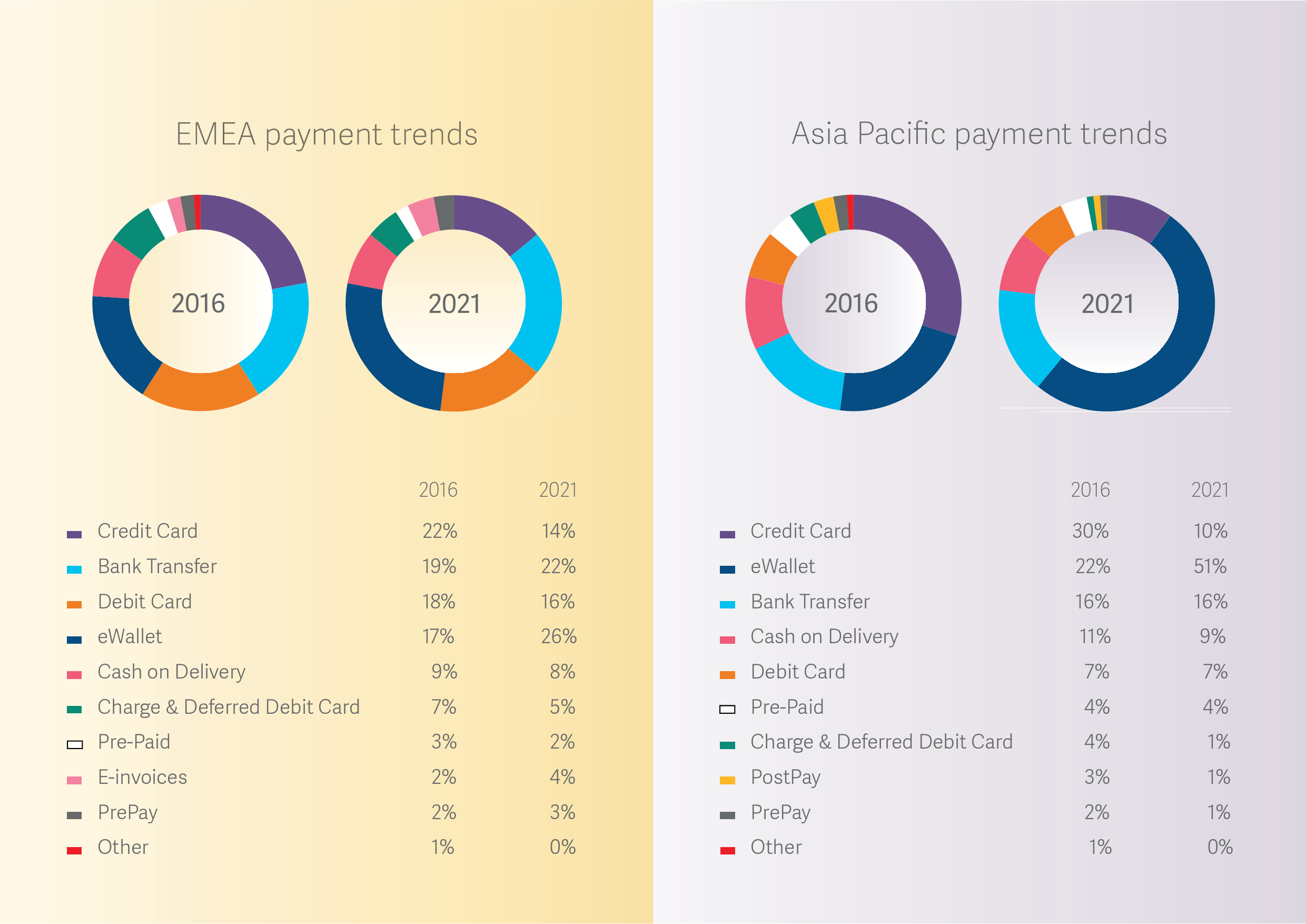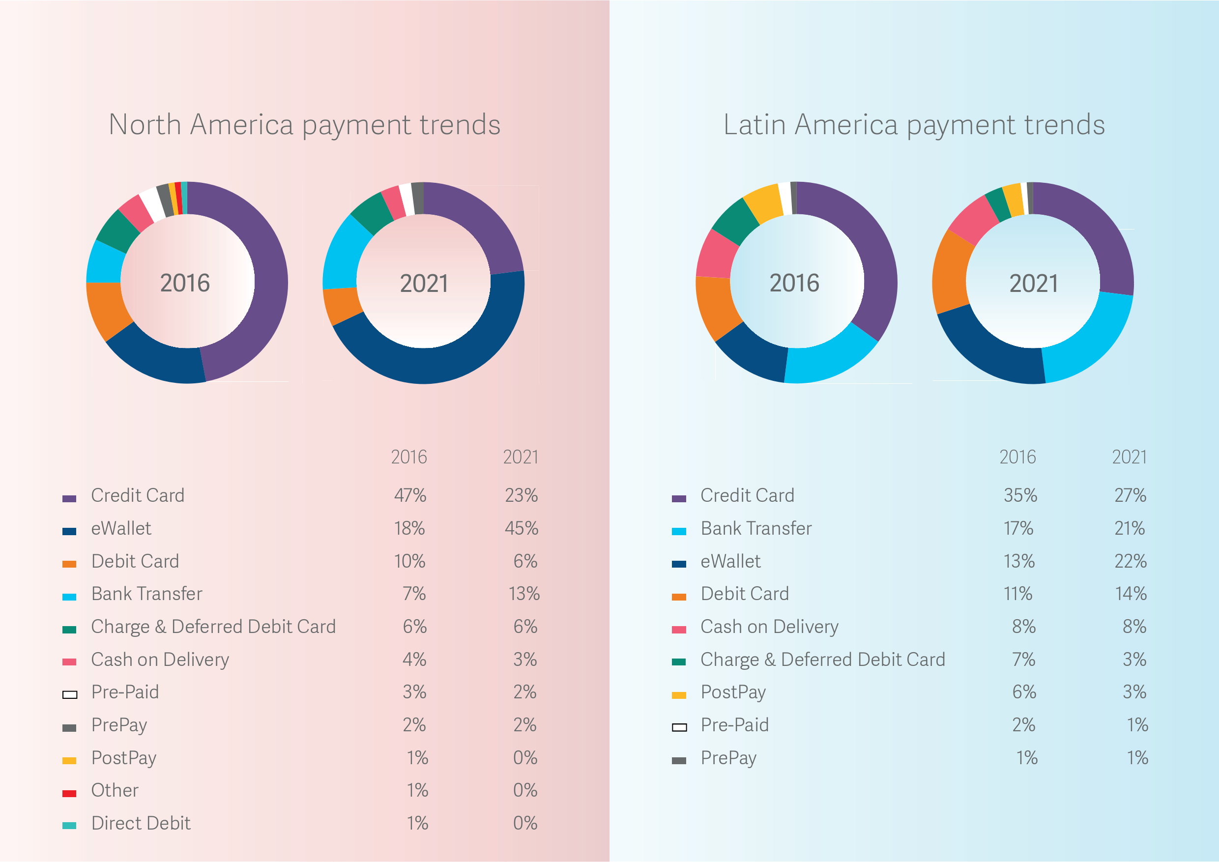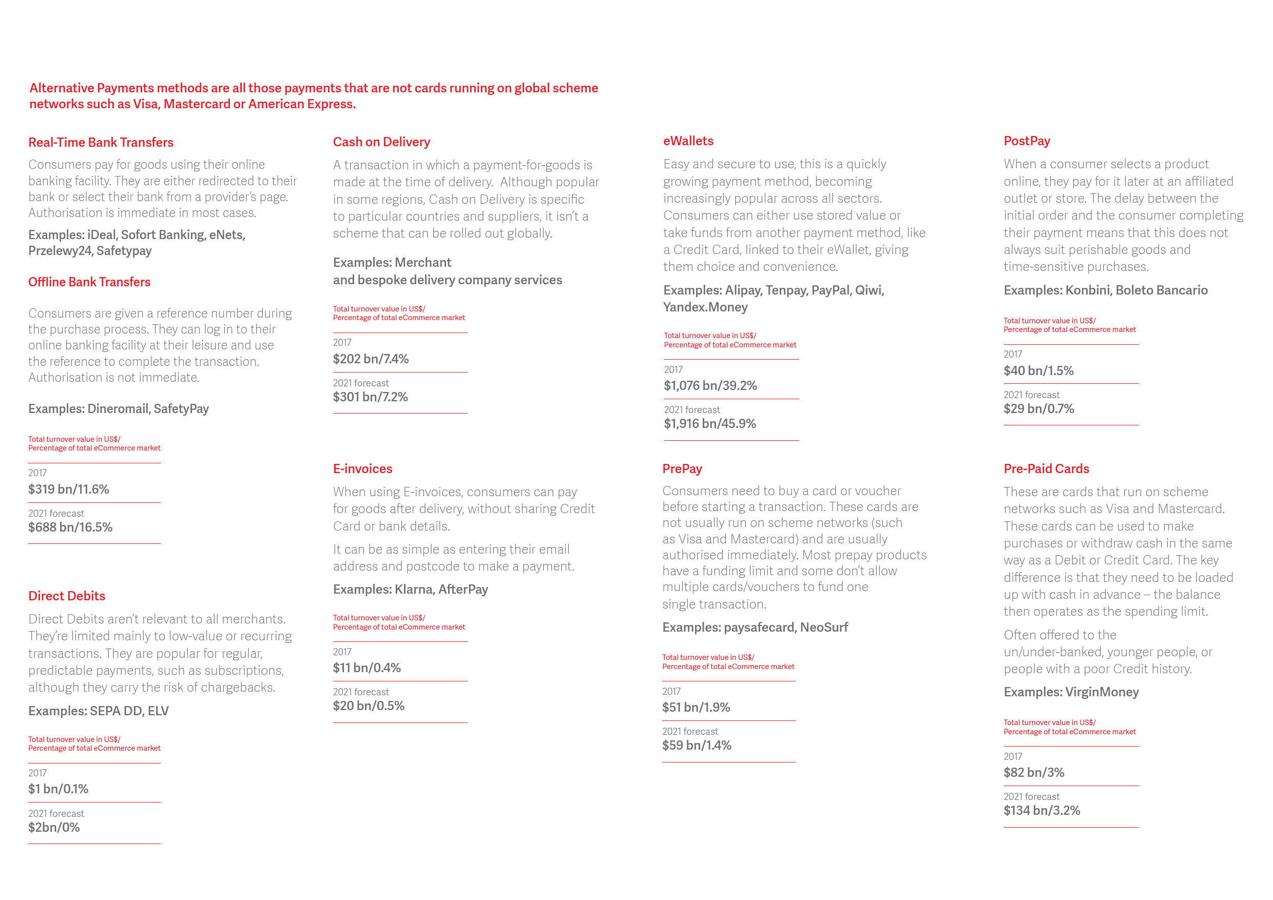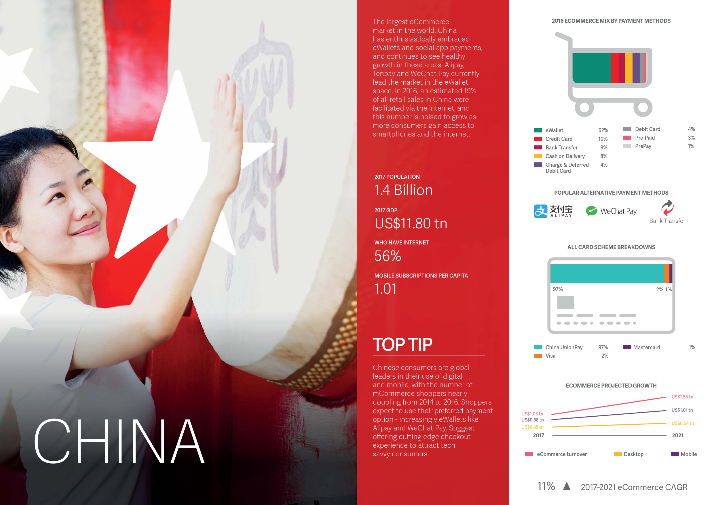- 银行转账预计将超过信用卡成为中国市场第二大支付手段。至2021年,银行转账将占中国电子商务市场的14.2%。