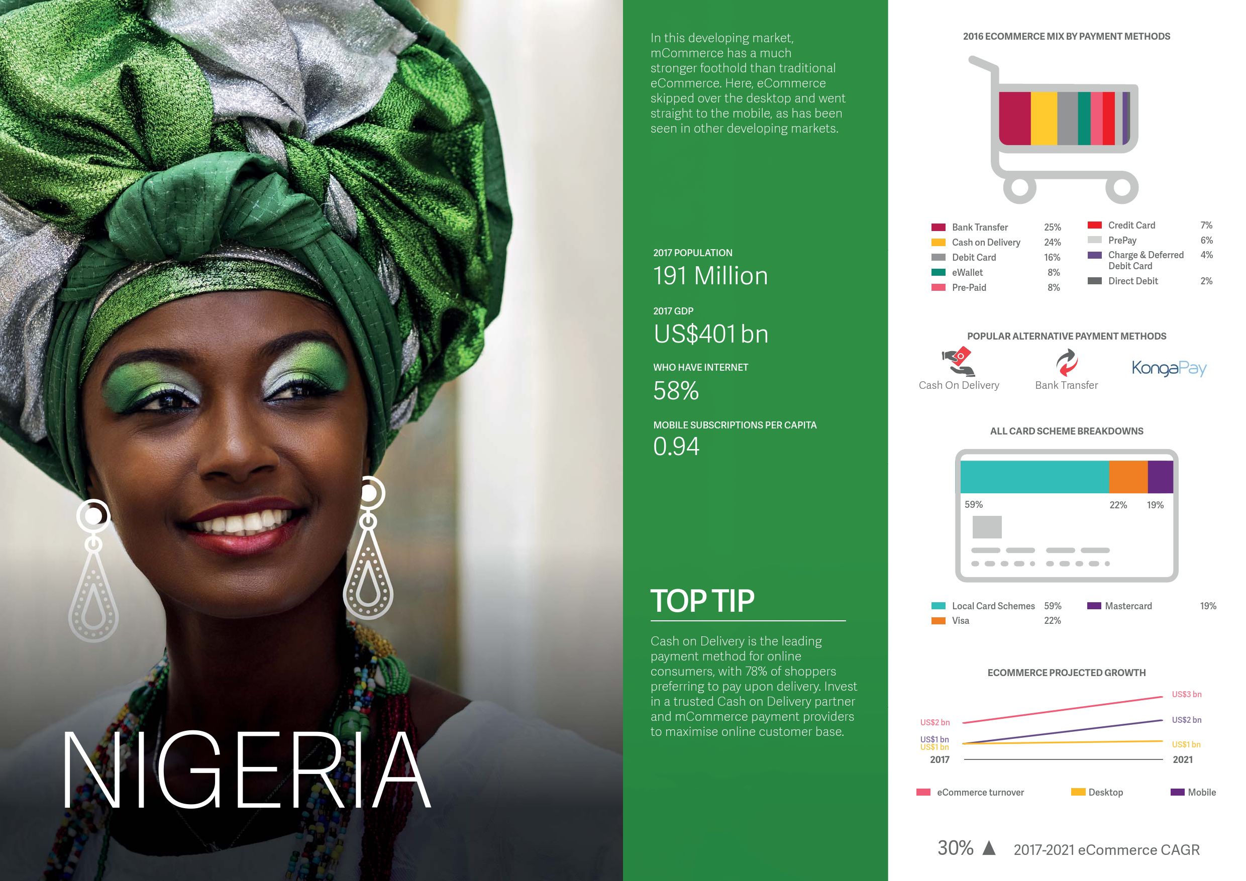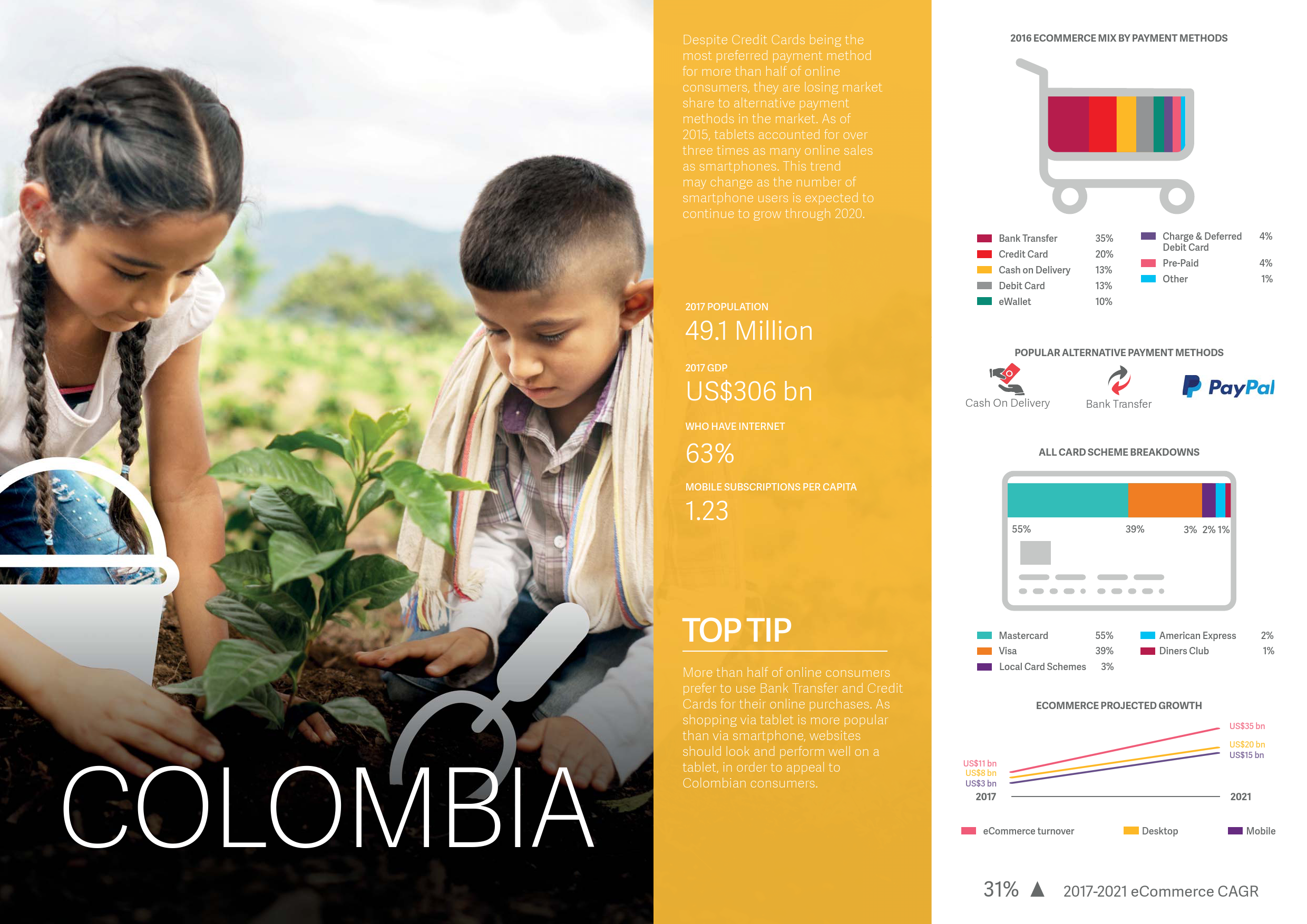 在未来五年,全球电子商务市场预计将以11%的平均速率增长。三大增长最快的电子商务市场将是哥伦比亚、阿根廷和尼日利亚。这三个市场的电子商务年增长预计将分别达到31%,30% 和24%。