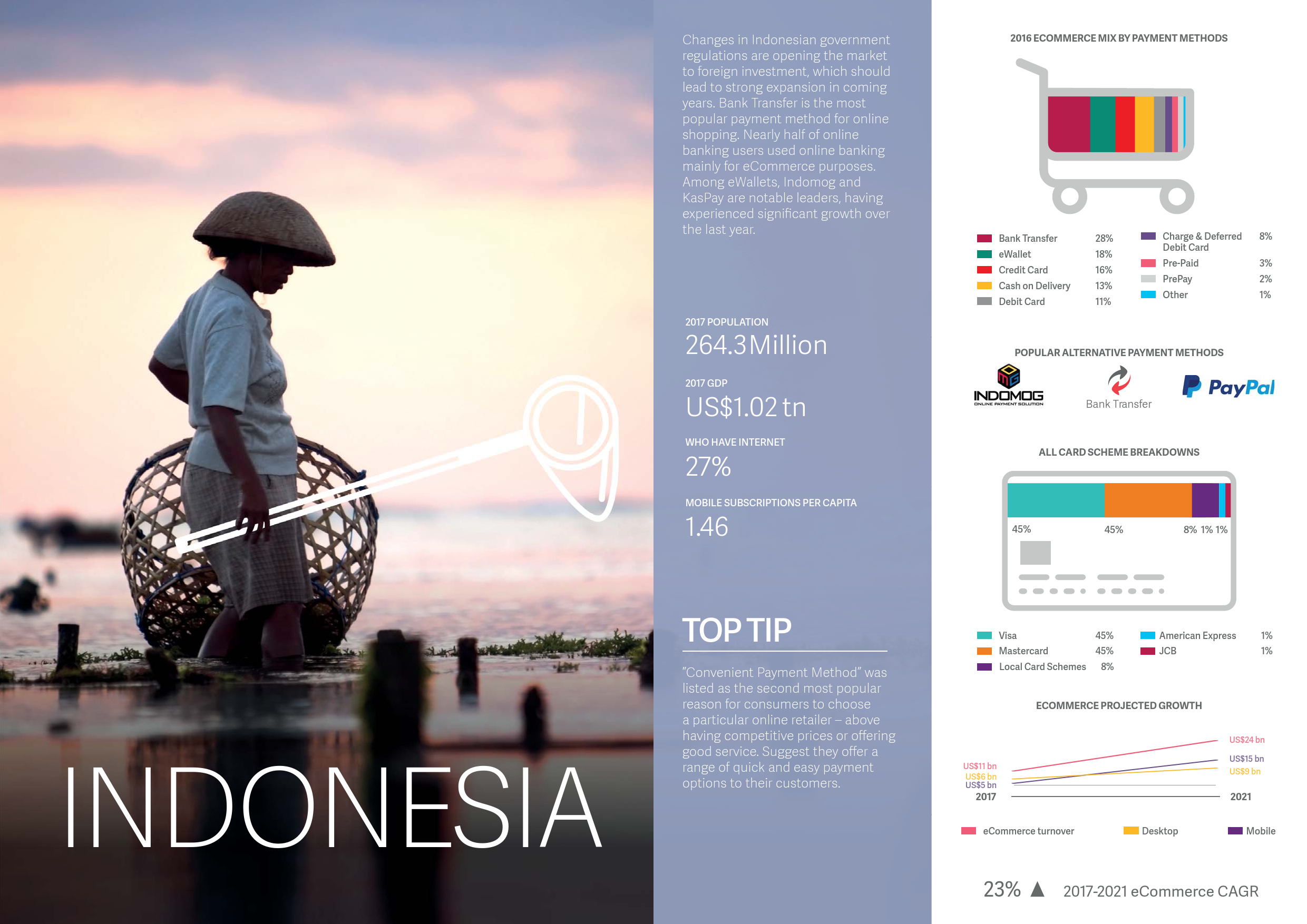 而在东南亚地区,中国的商户可考虑拓展韩国和印度尼西亚市场。韩国电子商务预计将实现19%的年复合增长率,于2021年达到810亿美元的市场规模;而印度尼西亚的电子商务市场预计实现23%的年复合增长率,于2021年达到250亿美元的市场规模。