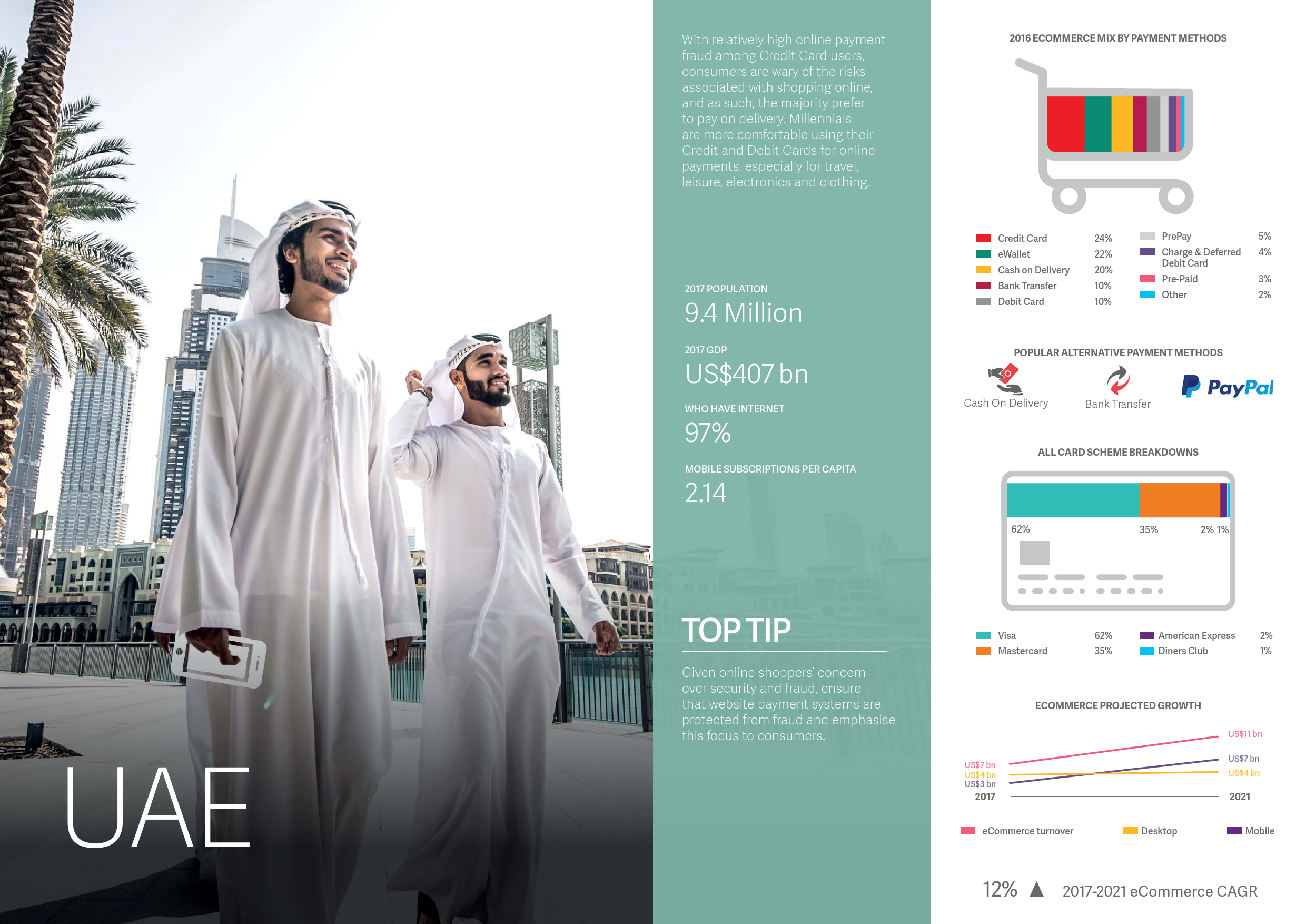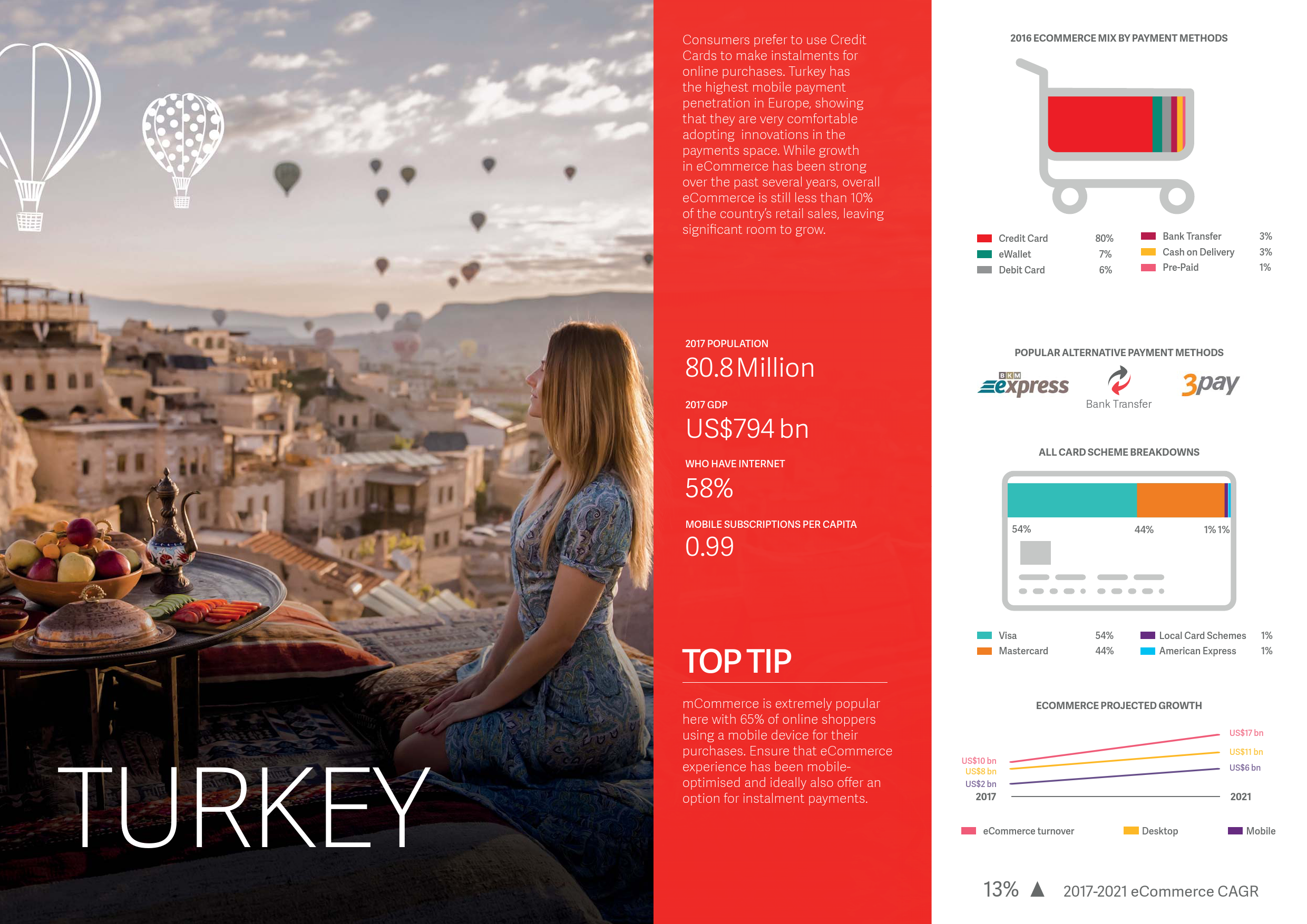 然而,在未来五年,EMEA地区(包括欧洲、中东和非洲)预计增长10%,从2017年的5,290亿美元增至2021年的7,800亿美元。EMEA地区高速增长的电子商务市场包括:英国,预计在2021年以9.7%的年复合增长率增至2,677亿美元;以及土耳其,预计在2021年以13%的年复合增长率增至170亿美元。