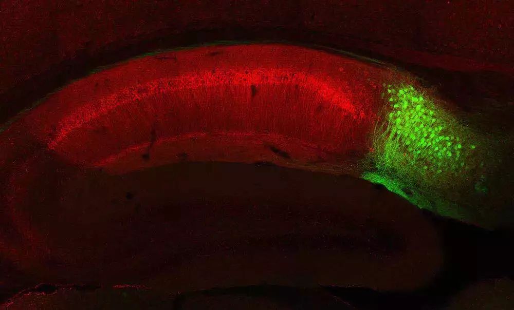 研究发现,海马神经元(红色)对新记忆的形成是必要的,但负责回想记忆的是海马下托部分的神经元(绿色)。