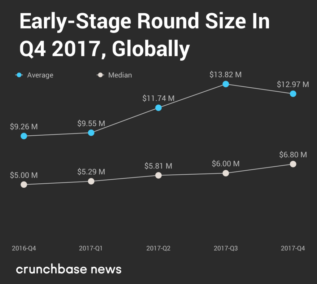2017年天使和种子投资平均值和中位数分别是105万美元和52.7万美元。