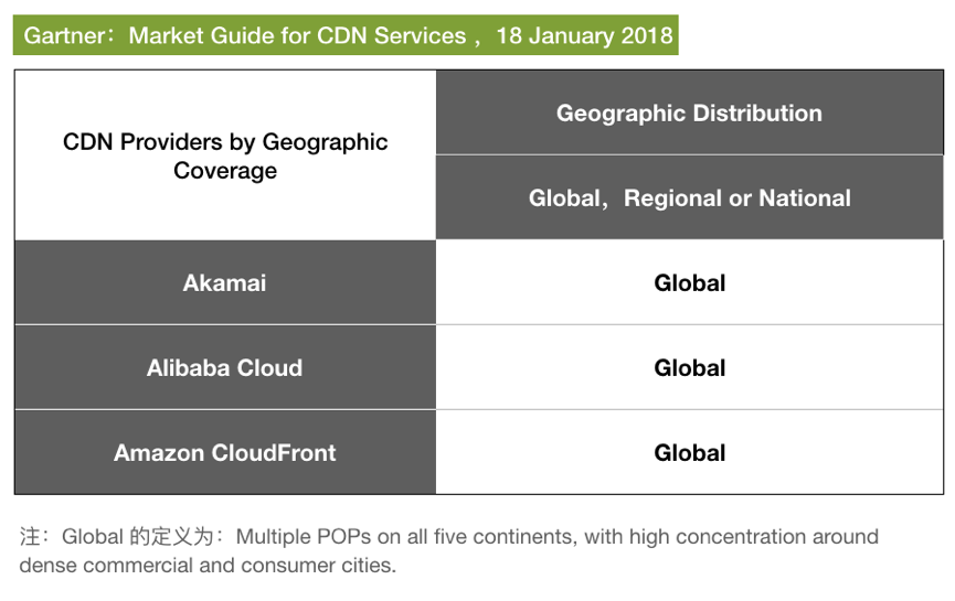 独立咨询机构Gartner日前发布最新全球CDN服务市场指南《Market Guide for CDN Services》,阿里云凭借全球服务能力和产品技术优势被评为Global(全球级)服务商,即面向全球五大洲提供围绕密集商业和消费城市的接入服务。