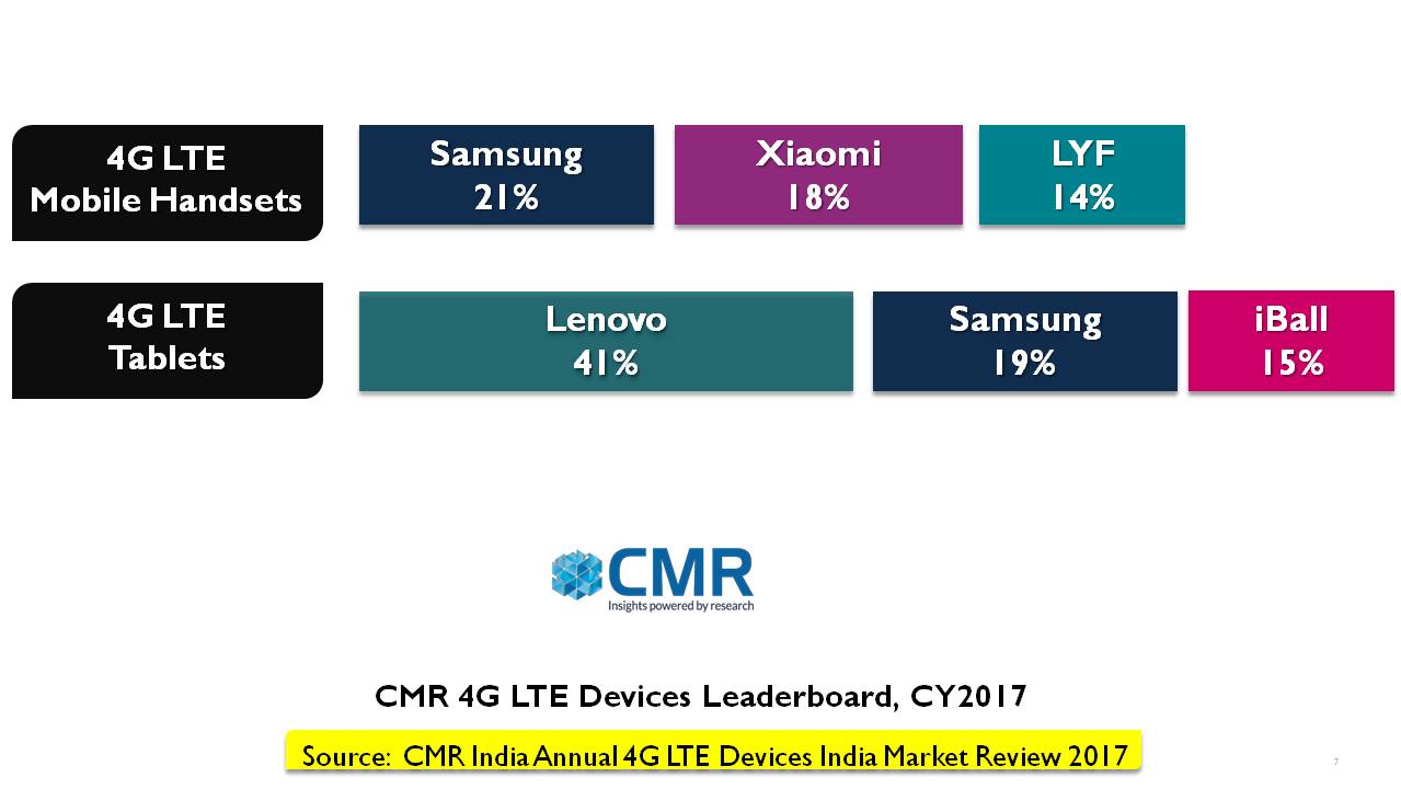 2017年,三星在印度4G LTE手机市场的份额达到21%,而联想则以41%的市场份额主宰印度4G LTE平板电脑市场。 LYF是排行榜上唯一一家印度品牌,在印度4G LTE手机市场的份额是14%。
