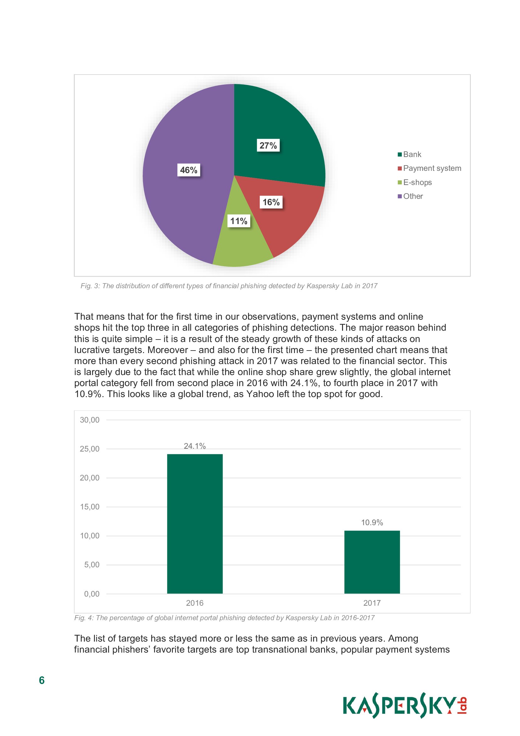 2017年,金融行业占网络钓鱼的份额从47.5%增加到54%。这是卡巴斯基实验室对金融行业钓鱼攻击的统计数据的历史最高值。