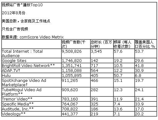 *视频广告纸包含流媒体视频一种形式,不包含其他如视频覆盖、嵌入型品牌视频广告、定向横幅广告等形式。备注:此外,2012年8月份的数据由于Video Metrix统计方法的改进导致数据结果也有所改变,由于标签机制的完善,Hulu的数据出现了一定的下滑。comScore提示,在处理月度变化数据时需要格外注意。
