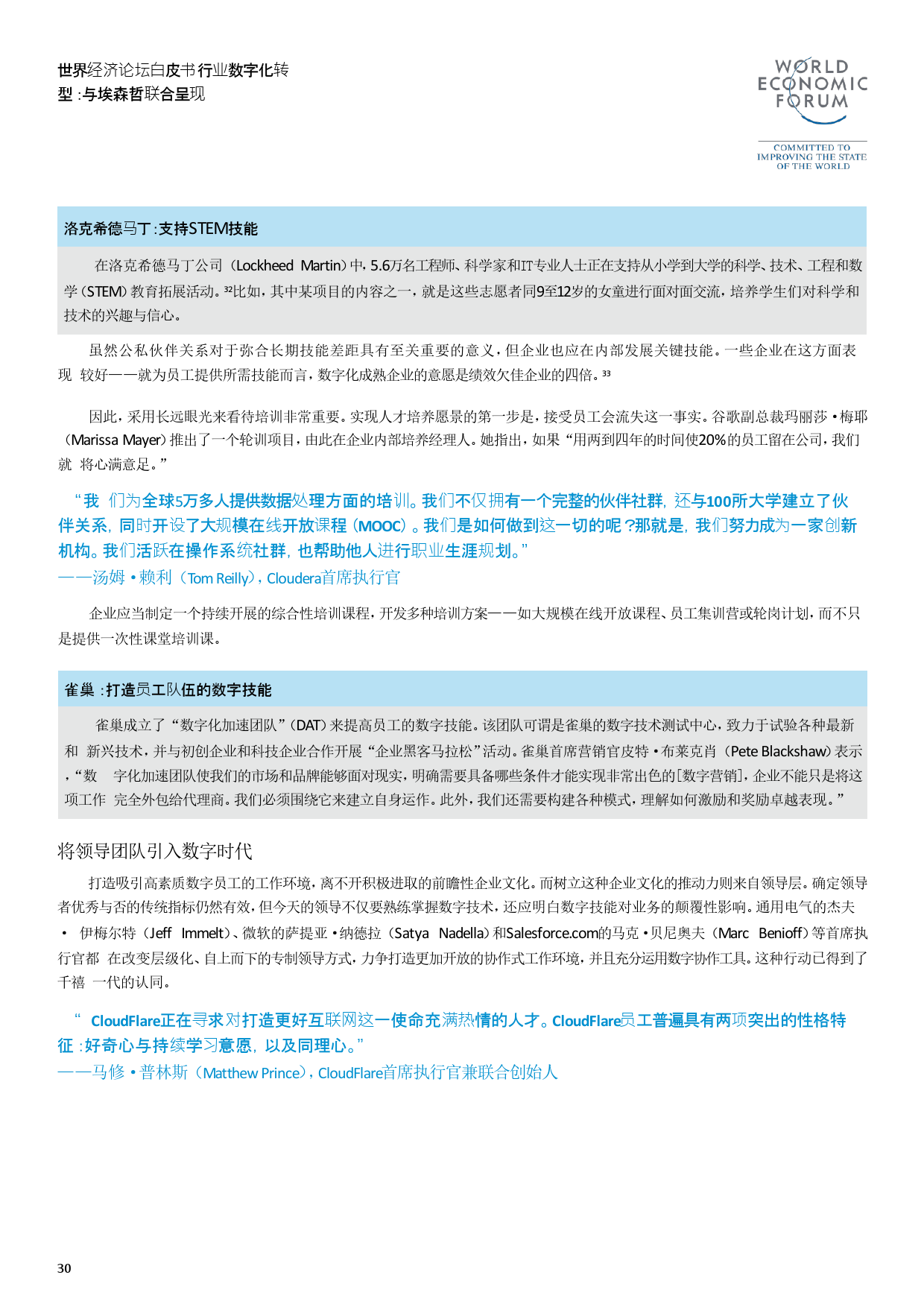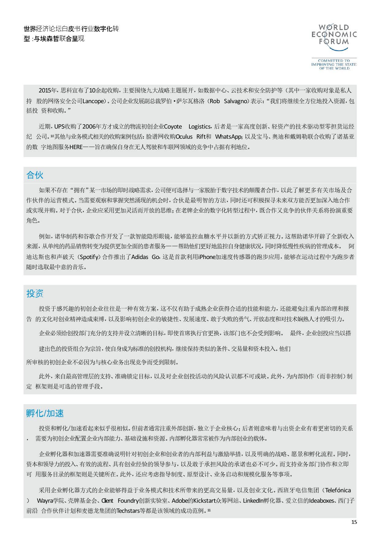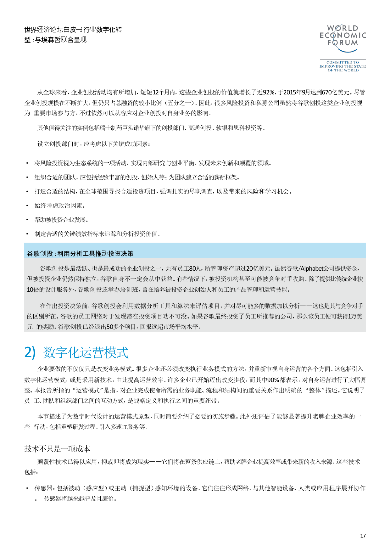- 数字化运营模式。本报告阐述了针对数字时代而设计的运营模式原型,并简要介绍了实施这些原型的必要步骤。数字化领军企业在核心和支持性职能部门运用了精益方法。