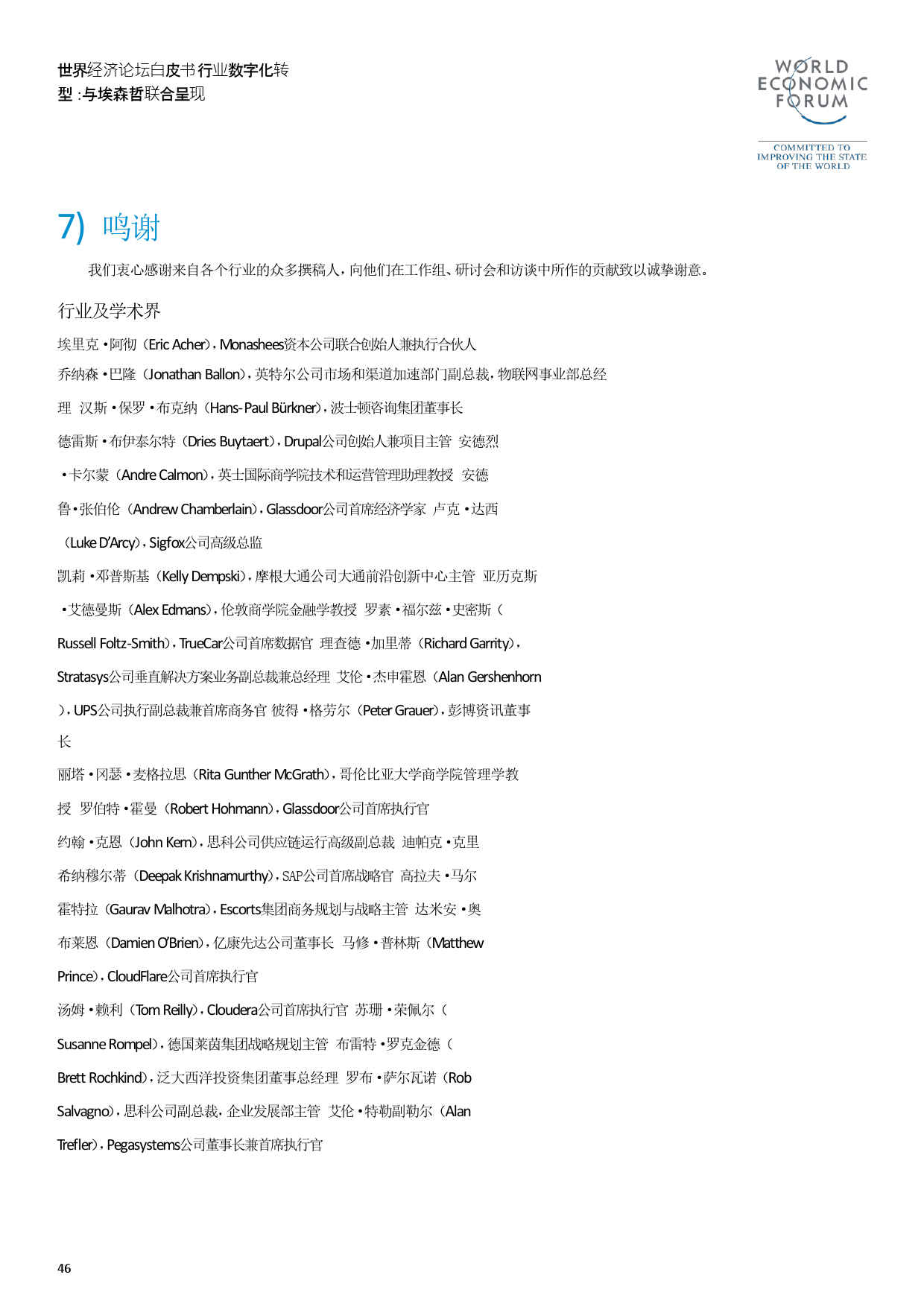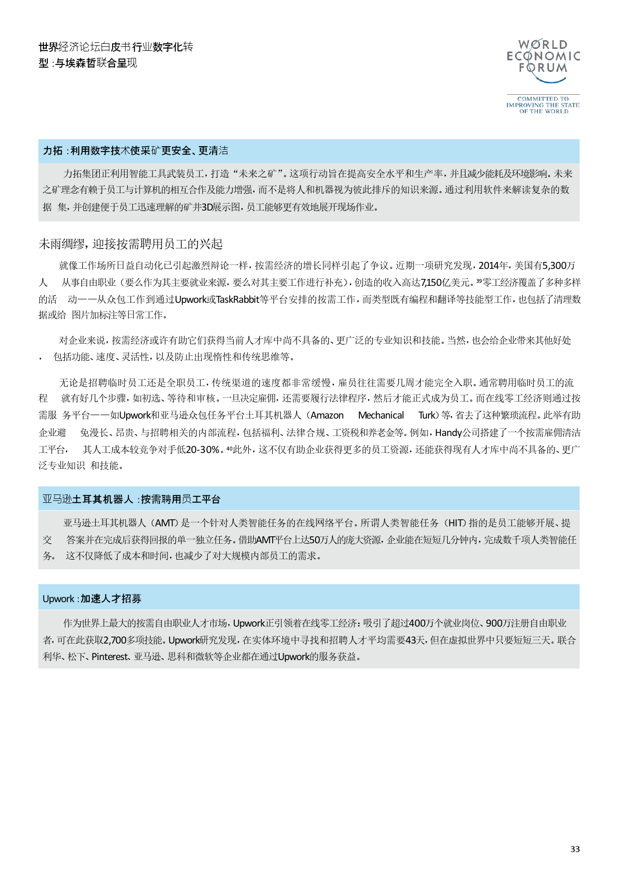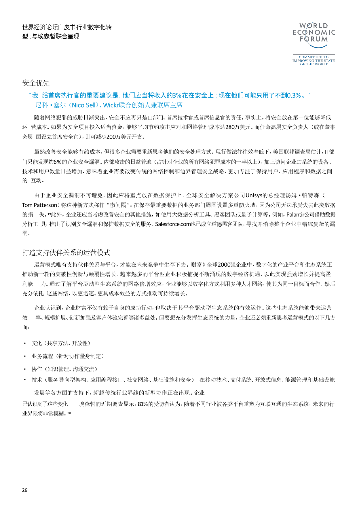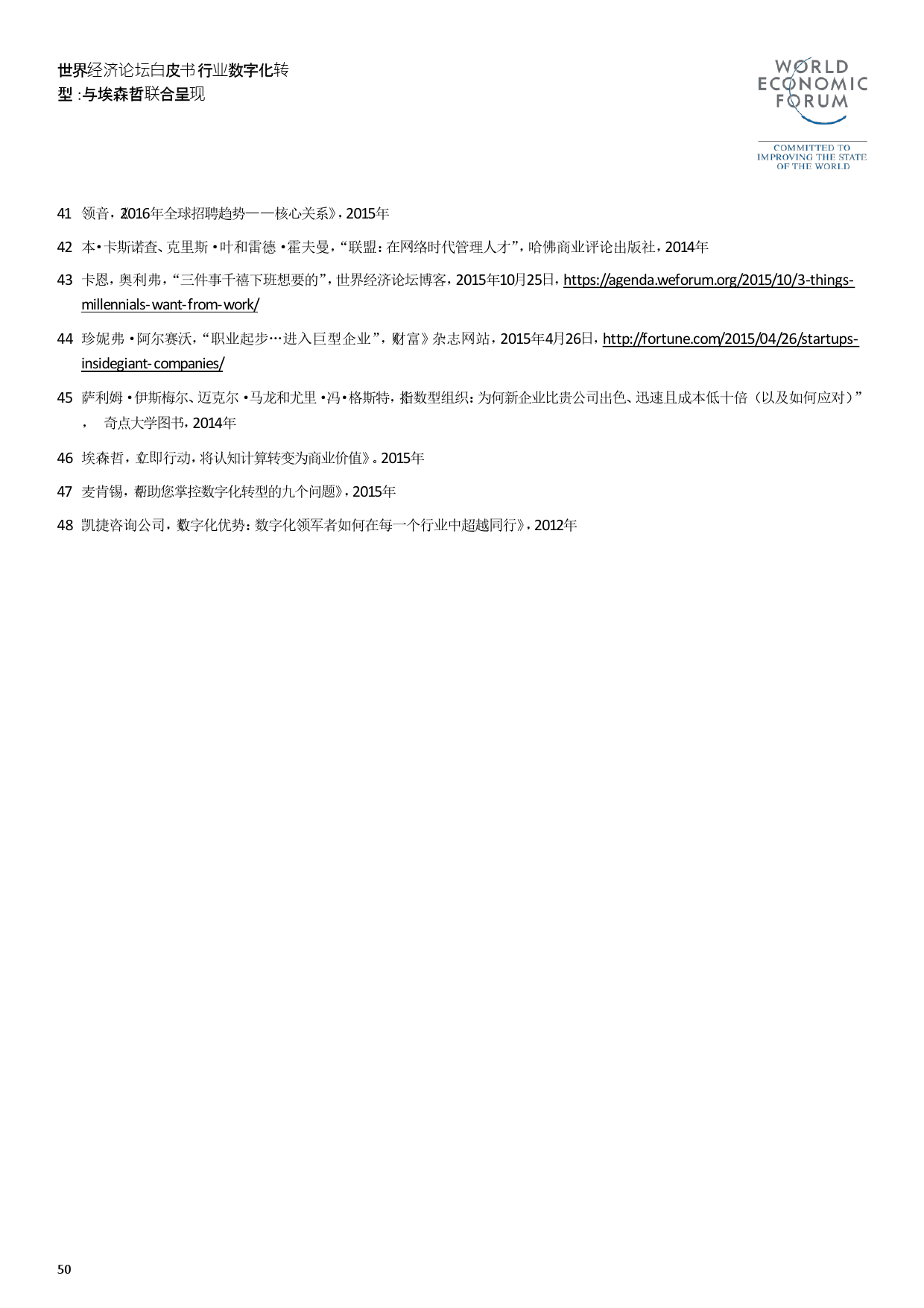 - 数字化人才与技能。本报告分析了企业吸引、保留和培养数字化人才的方法。报告同时强调,企业当务之急是积极推动文化转型,鼓励千禧一代加盟自身团队。最后,报告还评估了企业需如何适应不同的工作方式——是引入机器人,还是按需聘用员工。