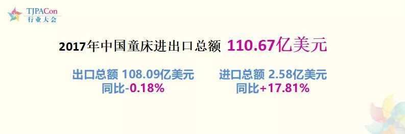 2017年中国童床进出口总额为110.67亿美元,童床(包括年龄段比较大的孩子的童床海关数据)出口总额为108.09亿美元,同比减少0.18%。进口总额为2.58亿美元,同比增加17.81%。