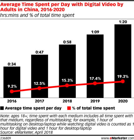 网络视频是移动设备使用时间增长的关键动力。2018年中国成年人每天会花58分钟观看视频,同比增长近26%,占网络时间的1/4以上。到2020年,中国成年人将1/3的日常网络时间用于观看视频。