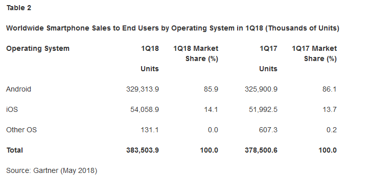 根据Gartner的数据,2018年第一季度全球智能手机销量回升,与去年同期相比增长1.3%。2018年第一季度全球共销售手机4.55亿部,其中3.84亿是智能手机,占手机销量的84%。