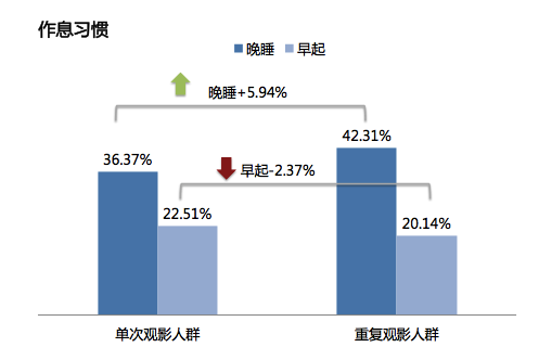 - 重复观影人群的TOP5兴趣偏好:同好社交、图片互动、卖萌自拍、娱乐资讯、科技资讯。在生活中,他们关注本地信息,是潮流的追逐者,也是健康生活的倡导者。在文化爱好上,他们是漫画、原创文章、有声读物的拥趸。