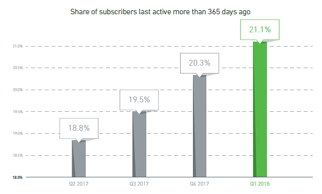 从非活跃订阅用户来看,整体点击率比去年同期增长6%,单独点击率则下降7%。第一季度,非活跃用户占营销人员数据库的1/4(22.1%)。随着全球隐私和数据法规越来越成熟,特别是GDPR的实施,营销人员一方面要努力确保合规,另一方面还要面临更多挑战,例如保留用户。