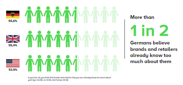 信誉不足,德国企业付出高昂的代价。德国消费者普遍认为企业滥用或泄露个人数据。1/4的德国人在过去12个月停止使用某个网络服务或零售商,因为不信任他们(25%),这数字在英国和美国分别是36%和35%。56%的德国人认为品牌和服务对他们的数据了解太多,55%的英国人和54%的美国人也这么认为。38%的德国人不知道新的数据保护条例,相比之下,英国人的认知度更高(28%)。美国人(79%)对GDPR 的了解最少。