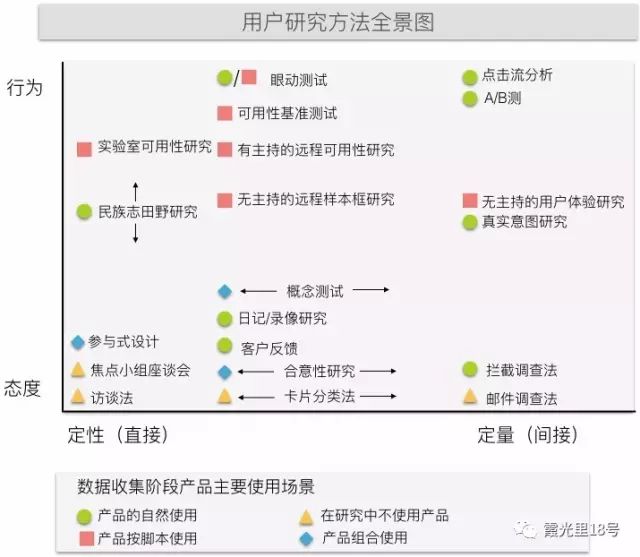 在这两端之间存在两个最受欢迎的方法:可用性研究和田野调查。如果它们将自陈法和行为数据融合加以利用,则可以往维度的两端移动。尽管通常被认为他们更倾向于行为维度那端。
