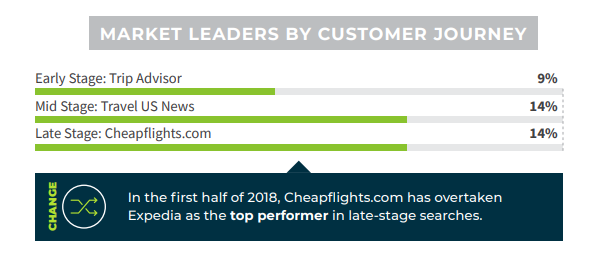 从客户旅程不同阶段的搜索结果来看,TripAdvisor在早期阶段表现最为出色,占总搜索访问量的9%。中期规划阶段,Travel US News则占主导地位,占比14%。Cheapflights.com2018年上半年赶超Expedia,在后期阶段的搜索排行中跃居首位,占14%。
