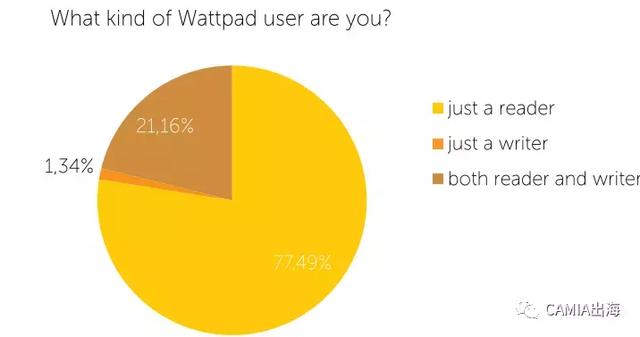 在使用电子书的受访者中有将近78%受访者只是Wattpad的读者,将近21%的受访者属于作者。