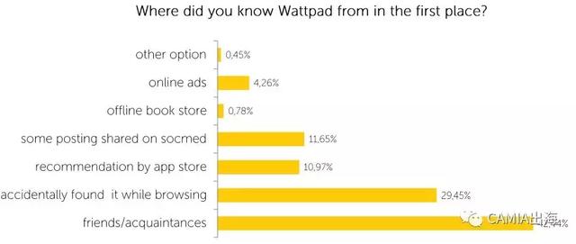 在使用电子书的受访者中有将近43%的受访者通过亲戚/朋友了解到Wattpad电子书。