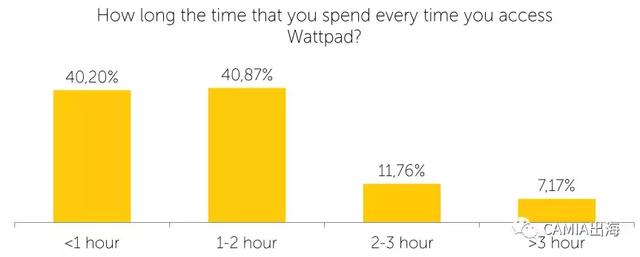 将近60%的受访者每次访问Wattpad电子书1个小时以上。其中有将近41%的受访者每次访问该app 1-2个小时。