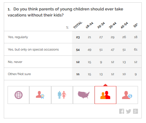 超过一半的美国人表示,有年幼孩子的父母应该只在“特殊场合”不带孩子旅行,而1/5的美国人认为孩子父母应该定期单独旅行(23%)。