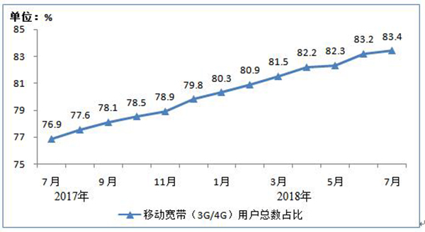 图3 2017年7月末-2018年7月末移动宽带用户总数占比情况