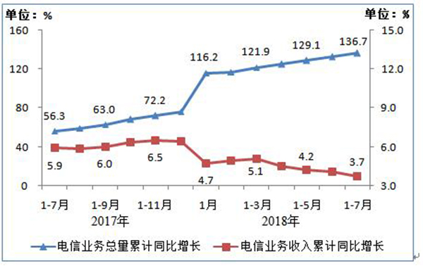 图1 2017年7月-2018年7月电信业务总量及收入累计增速完成情况