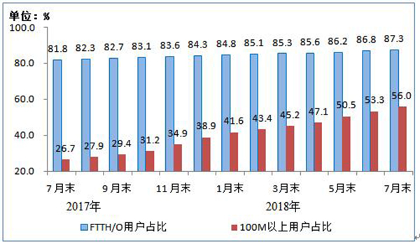图4 2017年7月末-2018年7月末光纤接入(FTTH/O)和100Mbps及以上接入速率的固定互联网宽带接入用户占比情况