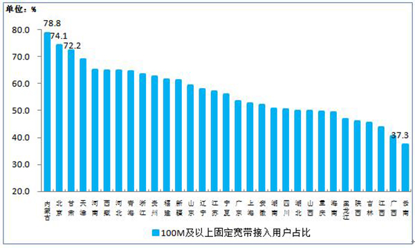 图9 100M及以上固定宽带接入用户占比各省分布情况