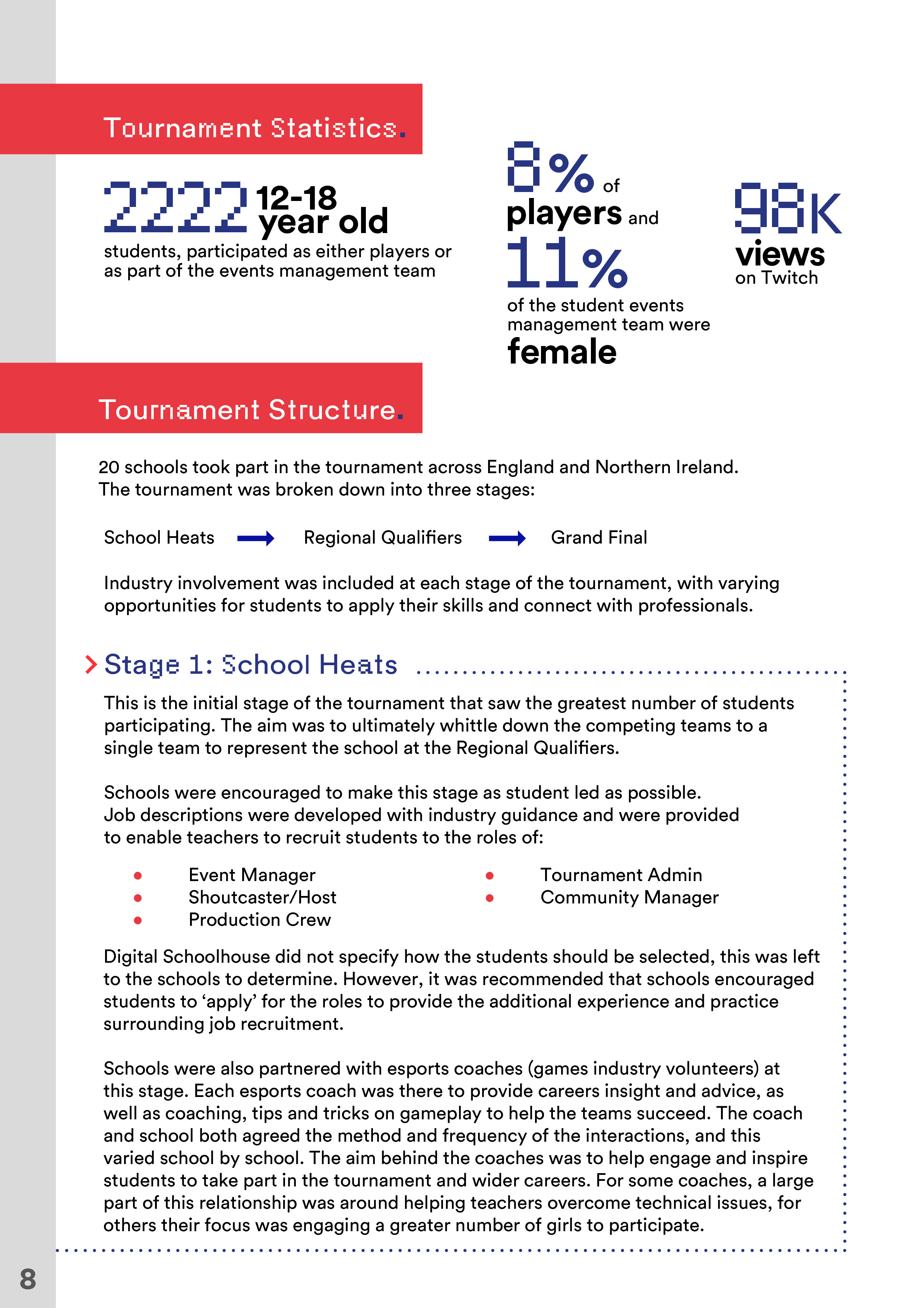 作为身临其境的职业教育体验,2017-2018赛季共有来自英国20所学校的2,222名学生参加,作为玩家或学校活动管理团队的一员。12-18岁的学生通过履行管理、制作、比赛管理、社区管理和直播工作,获得实用和相关的行业技能。