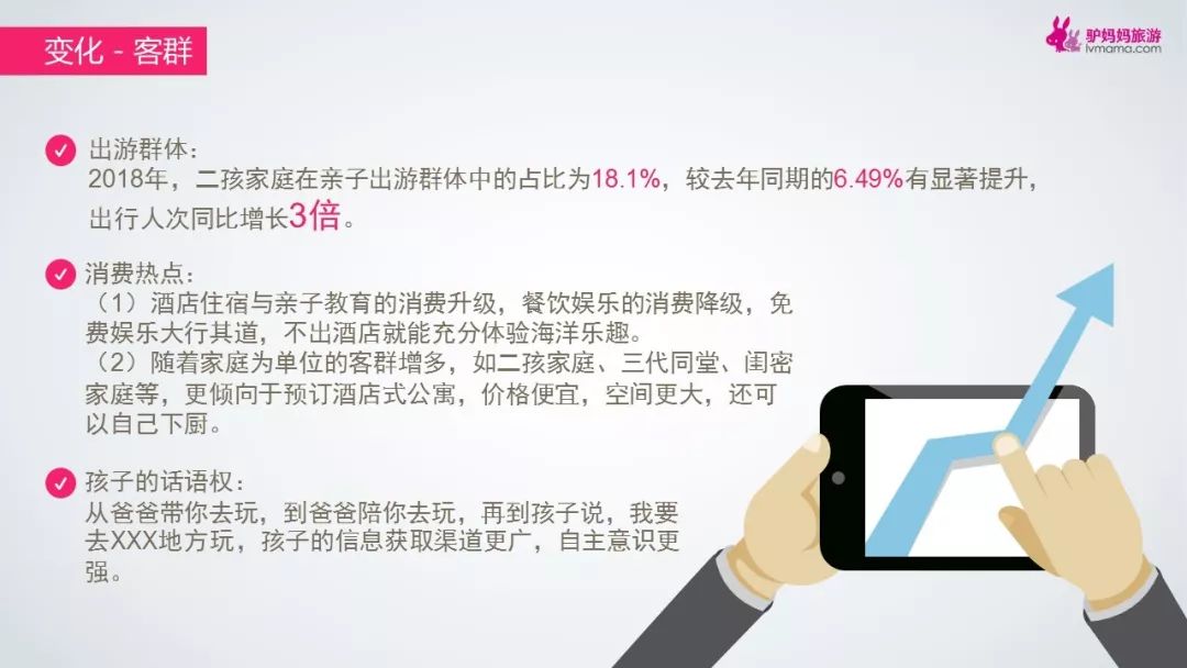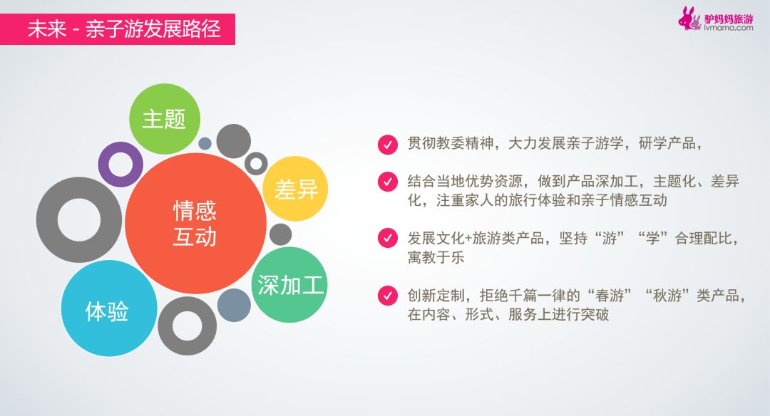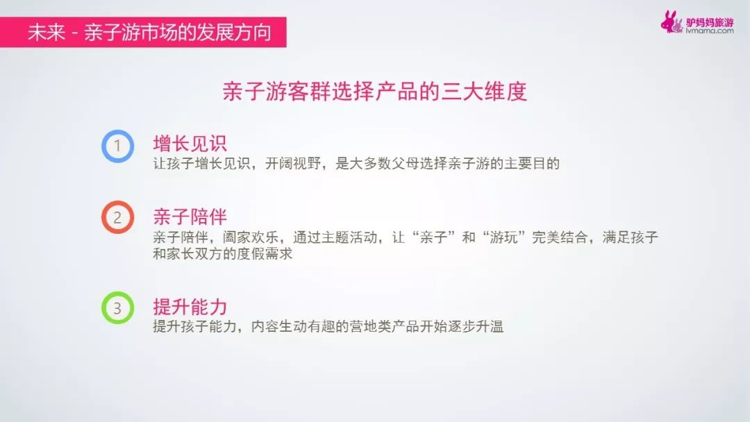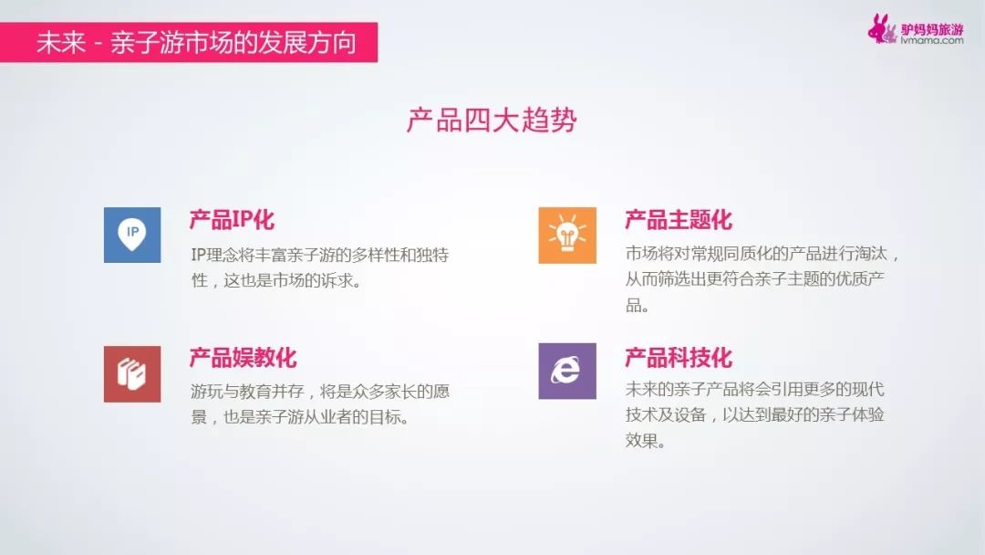 驴妈妈集团商旅定制游事业部总经理倪佳丽表示,伴随着亲子游高频化,中国亲子市场正进入提档升级阶段。如对安全、品质、体验的重视,已渗透各个环节。出游目的上,增加儿童见识、提升能力同时,更强调亲子间互动、兼顾儿童与成人度假体验。对此,亲子游产品供给也将朝着IP化、娱教化、主题化、科技化方向发展。