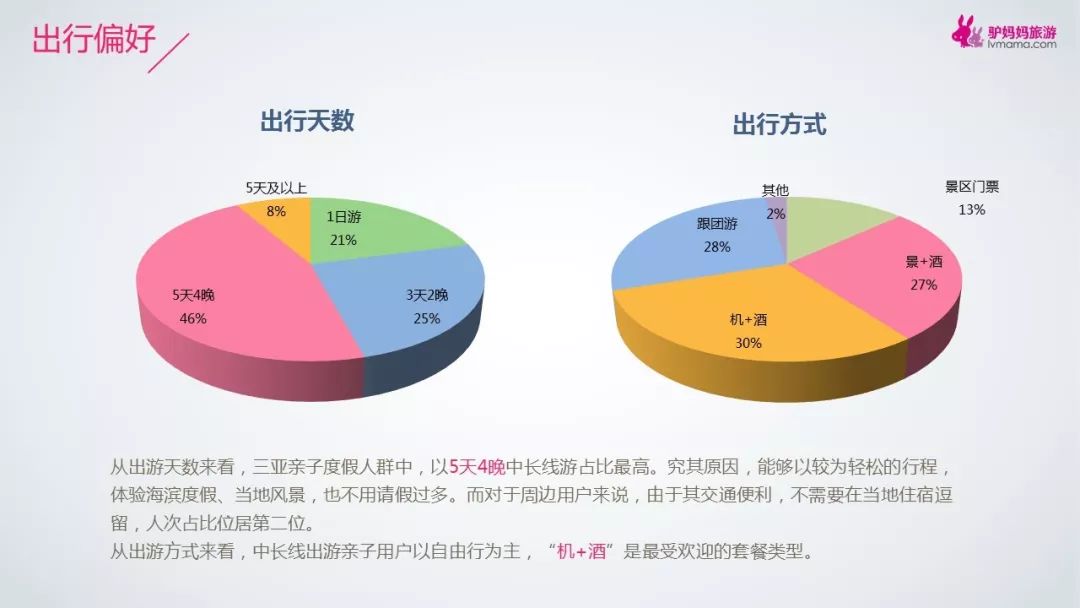 从出游儿童年龄来看,3-8岁年龄比最高。该年龄段儿童出行需求主要以玩乐、探索为主,教育目的占次要。驴妈妈定制游推出的自然课堂、传统文化、科学探索、亲子教育、户外运动等五大主题产品,与三亚海湾度假特色,及主题酒店丰富多元的亲子教育内容有着天然契合,而因也颇受欢迎。