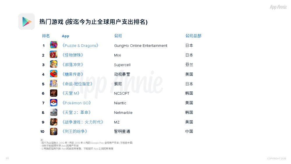 - 2012年1月-2018年8月,Google Play总下载量达近3,300亿次,总用户支出超过850亿美元,用户支出超过100万美元的App超过5,000款;截至2018年8月,Google Play中可用App总数量超过280万款。
