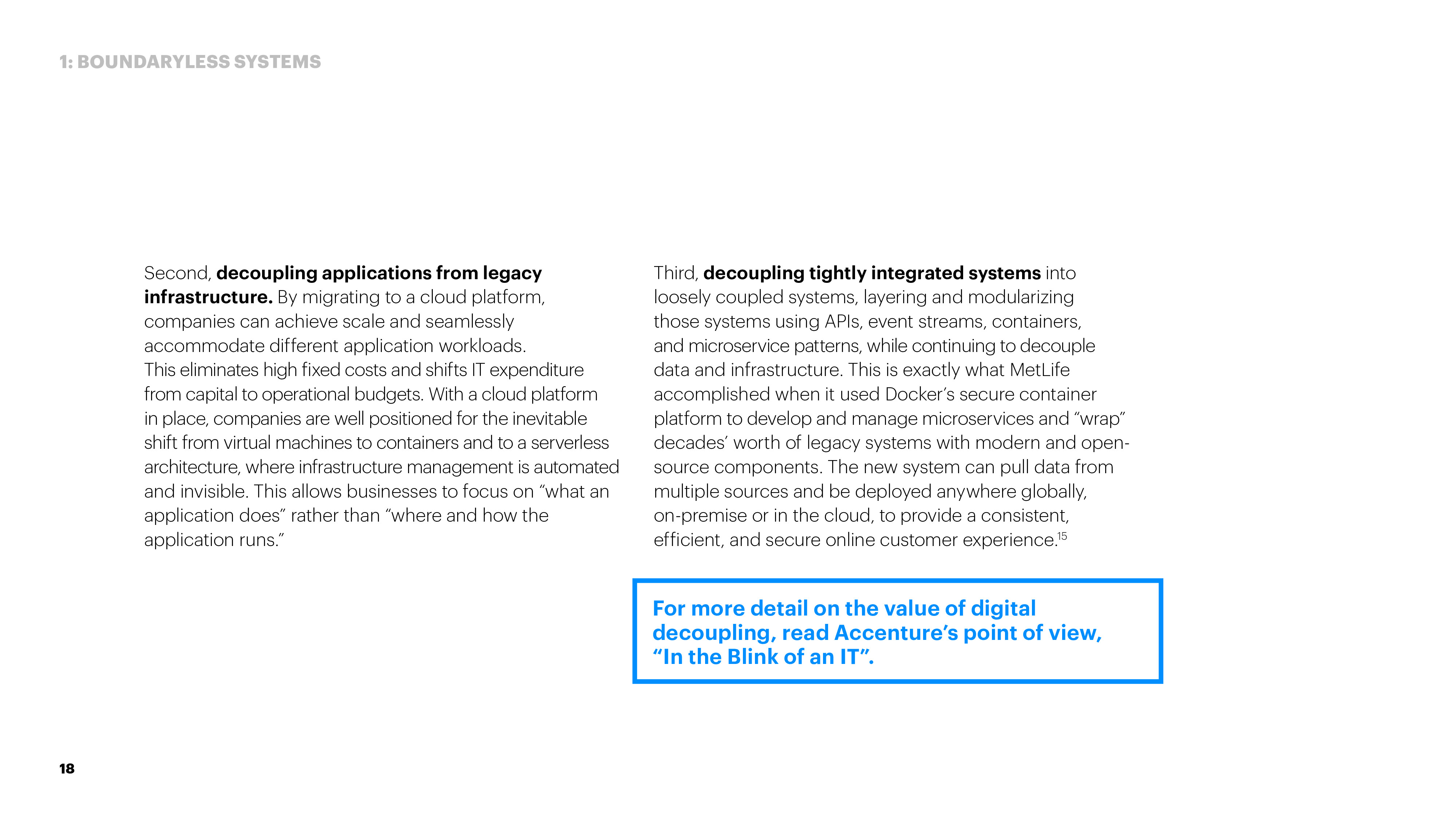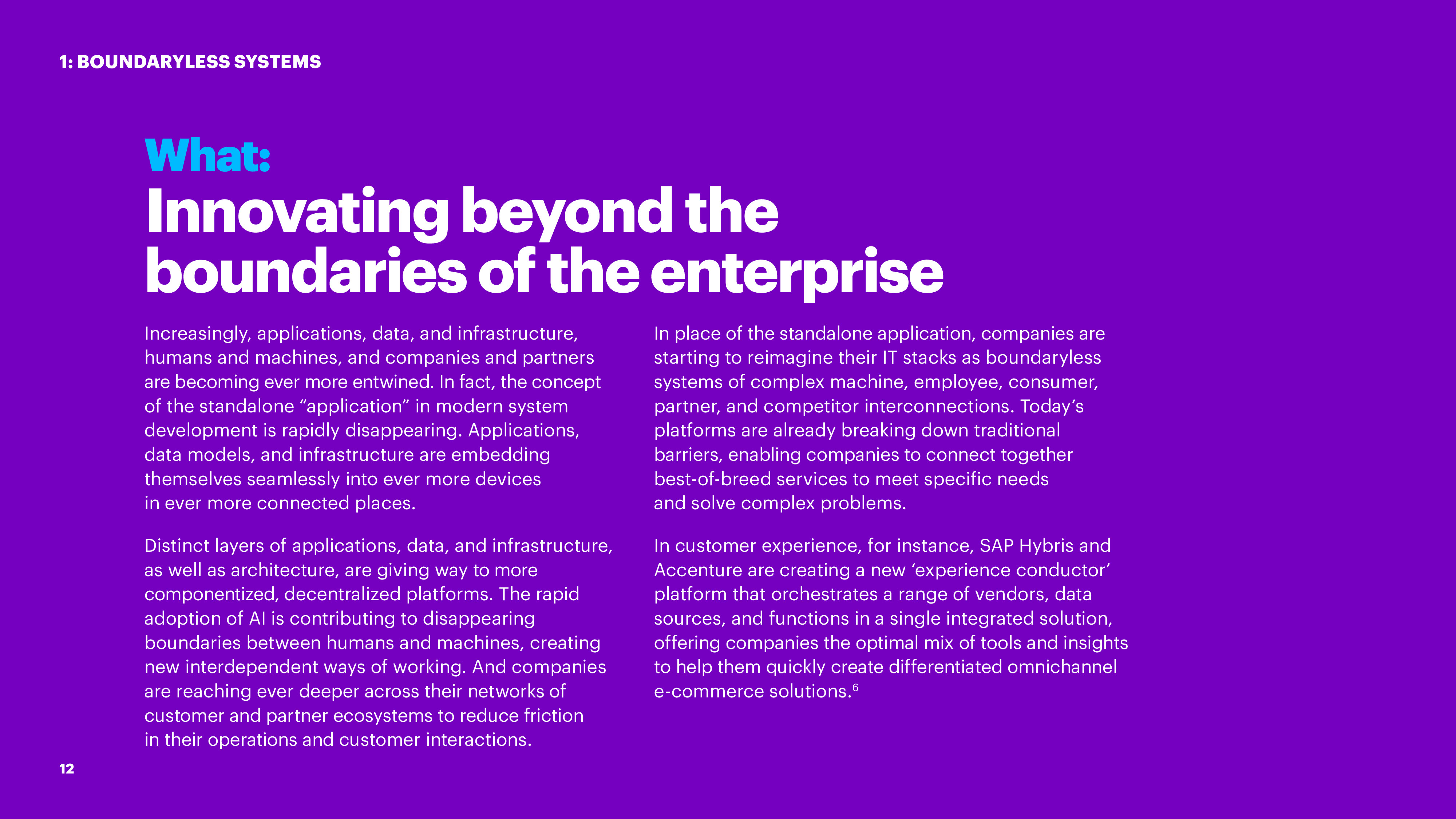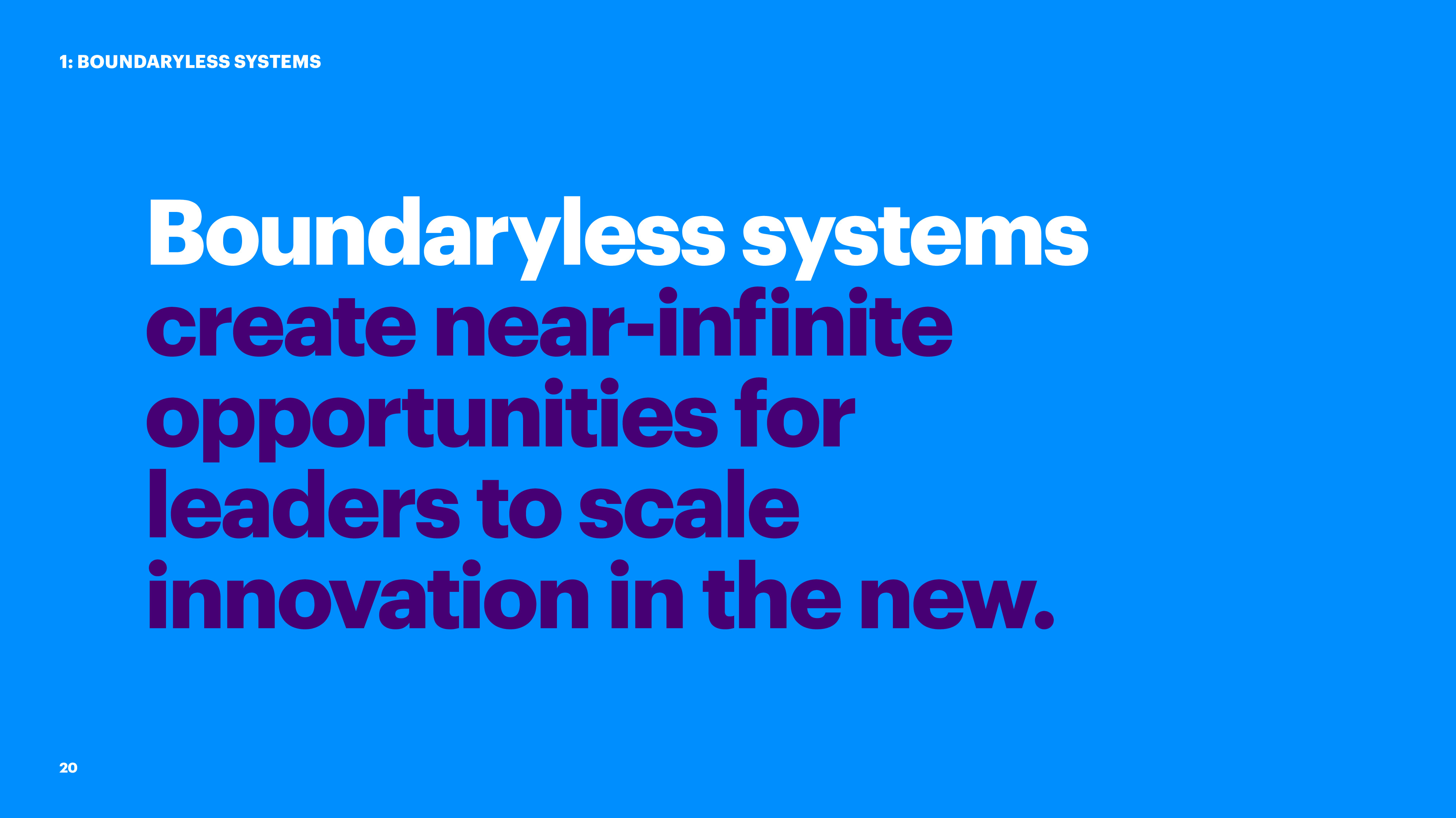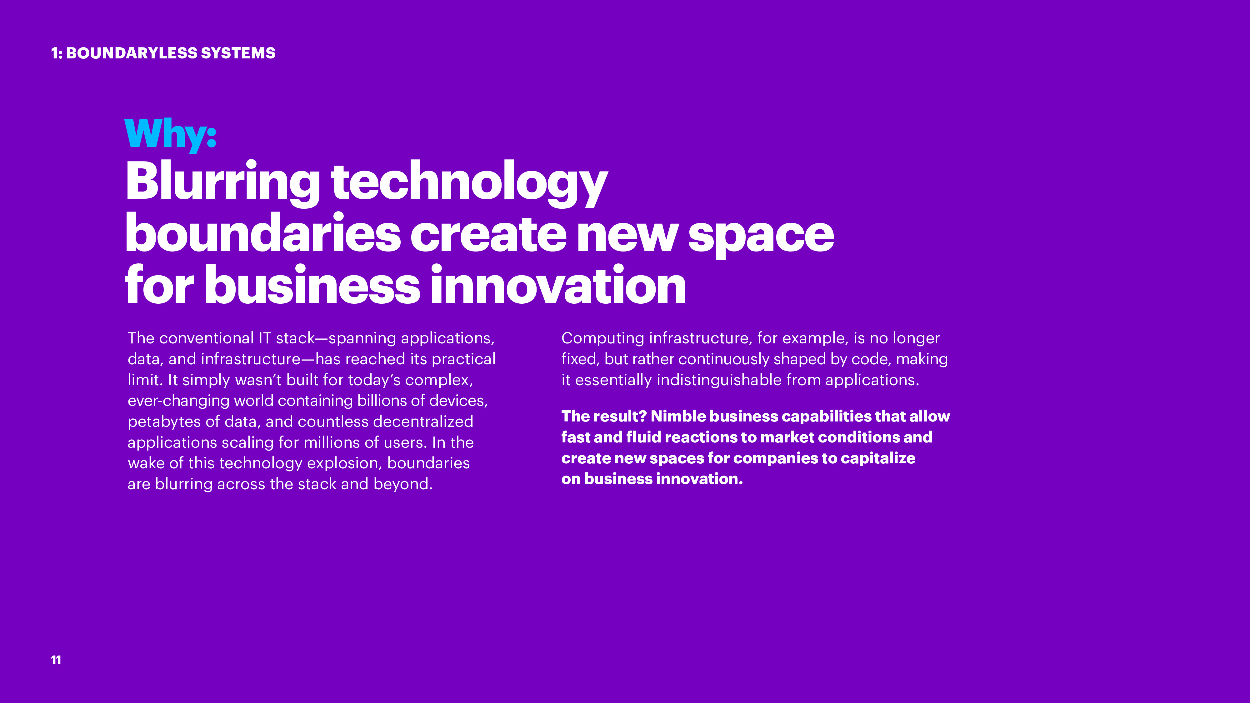 无边界。传统的IT堆栈已经达到了推动业务创新的实际限制。新兴系统正在打破障碍,为创新提供新的空间,以解决重大的业务、消费者和社会问题。