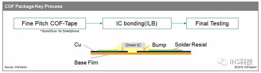 COF工艺可分为三个关键阶段:细间距COF载带,IC封装(内部引线键合[ILB])和最终测试。与大尺寸COF产品相比,智能手机COF产品的间距应该更窄 – 一般来说 – 20微米或更小,然而,更窄间距COF载带以及封装的生产能力和产能都是有限的。此外,由于TDDI-COF产品的测试时间比一般的要长,因此如果没有新的投入,测试产能也将面临挑战。