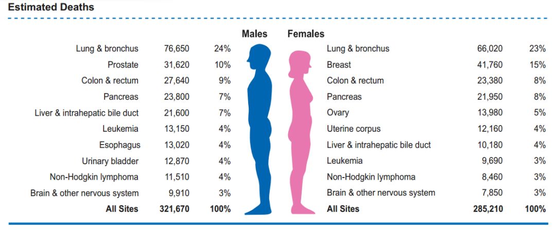 至于死亡人数,模型估算结果为606880例,比去年少两千余例,变化不大。男性因肺癌、前列腺癌和结直肠癌死亡最多,女性则是肺癌、乳腺癌和结直肠癌。要注意的是肺癌死亡病例将占到所有癌症死亡的1/4。
