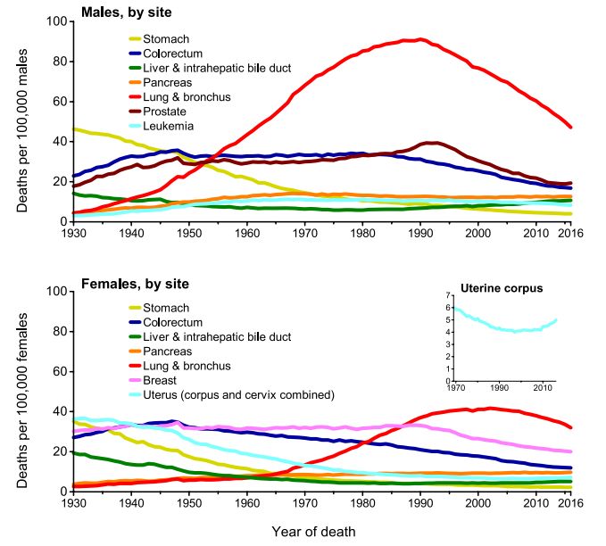 从20世纪70年代中期至今,除了子宫癌之外的所有常见癌症生存率都有所提高,虽然考虑到乳腺癌和前列腺癌等癌症可能是早期诊断技术的进步带来了偏倚,不过在造血和淋巴恶性肿瘤方面,由于靶向治疗的发现和治疗方案的进步,患者生存率已经有了长足的提升。