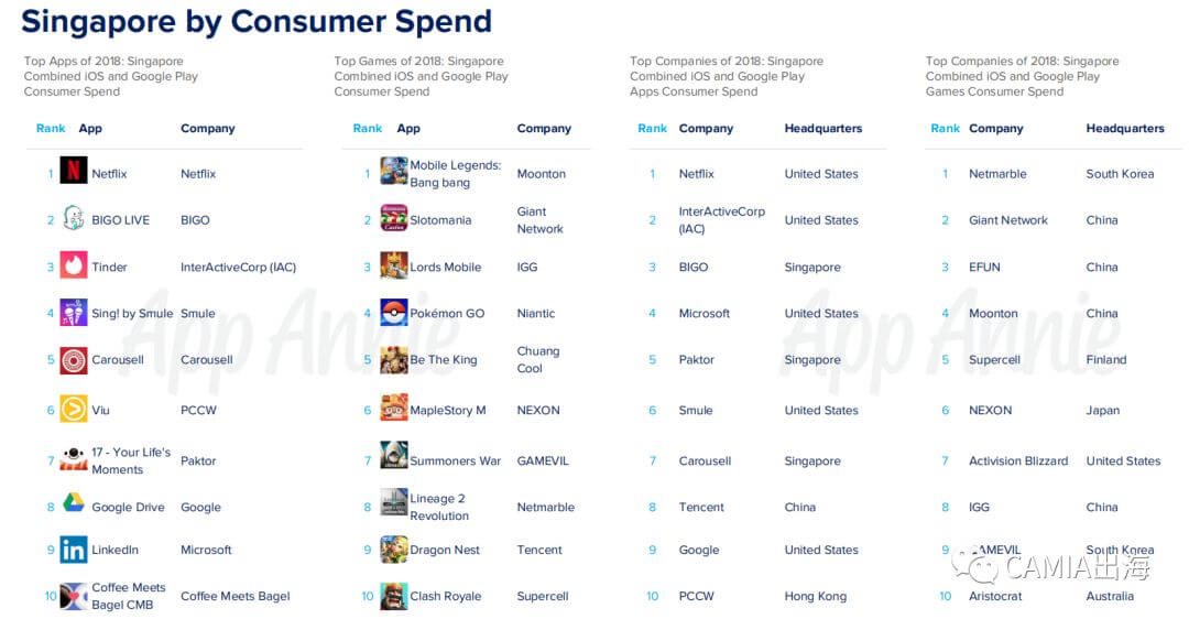 应用付费TOP 10公司榜单中有新加坡BIGO、中国腾讯和PCCW。而游戏付费TOP 10公司榜单中有五家为中国公司:沐童科技、腾讯、智明星通科技、昆仑万维科技和IGG。