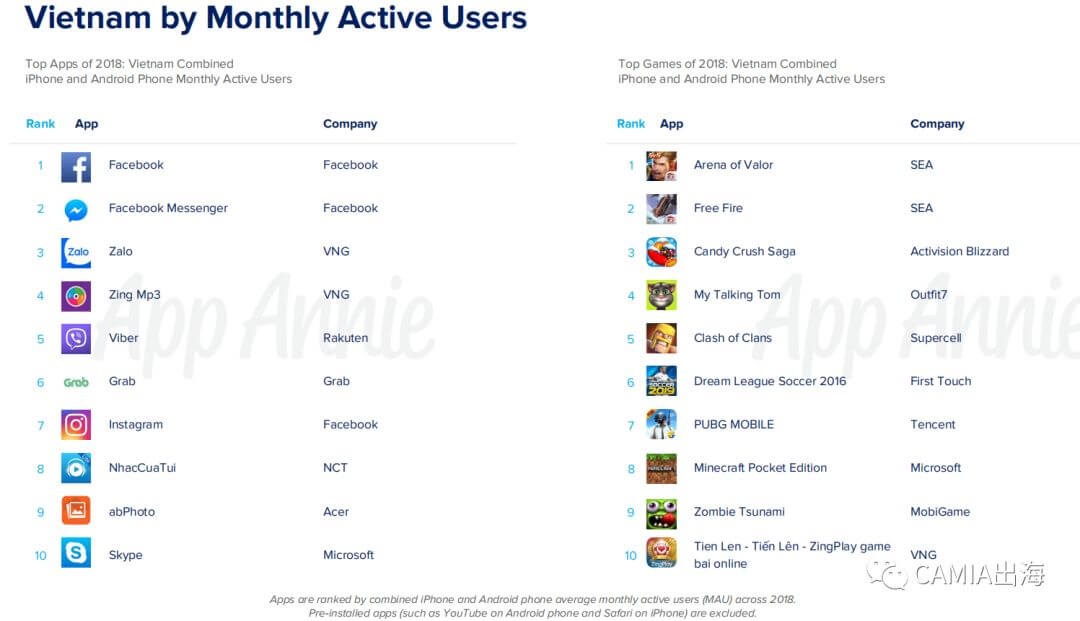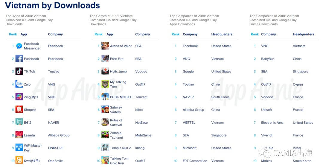 而获得最佳应用下载量TOP 10公司榜单中有五家来自中国:阿里、猎豹、头条、Hago Game和众联极享科技。此外还有新家坡SEA和Grab两大公司。