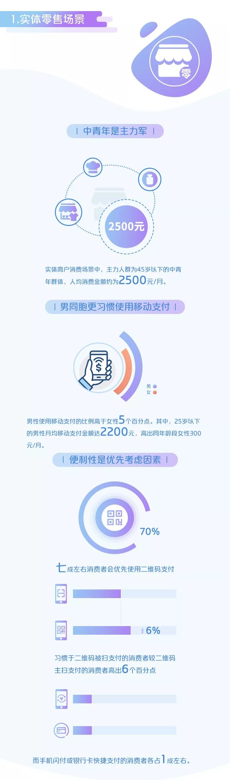 移动支付在公共交通领域占比越来越高,近3成消费者日均使用超5次,创业者、广告/媒体、家庭主妇和退休老人成为主要消费人群。在医疗服务领域,家庭主妇、军人和退休老人是使用移动支付的高频次人群。此外,作为普惠金融重要组成部分的金融理财领域,移动支付的表现也可圈可点,数据显示,退休老人,军人和家庭主妇较其他职业人群更热衷于购买理财产品,对现金资产的投资保值增值意愿更为强烈。从地域来看,江浙沪全面步入移动支付消费时代,安徽、山东、甘肃等地实体店移动支付消费占比高。从支付方式看,二维码仍是目前市场最为流行的移动支付方式,手机闪付越来越受到年轻高收入人群欢迎。
