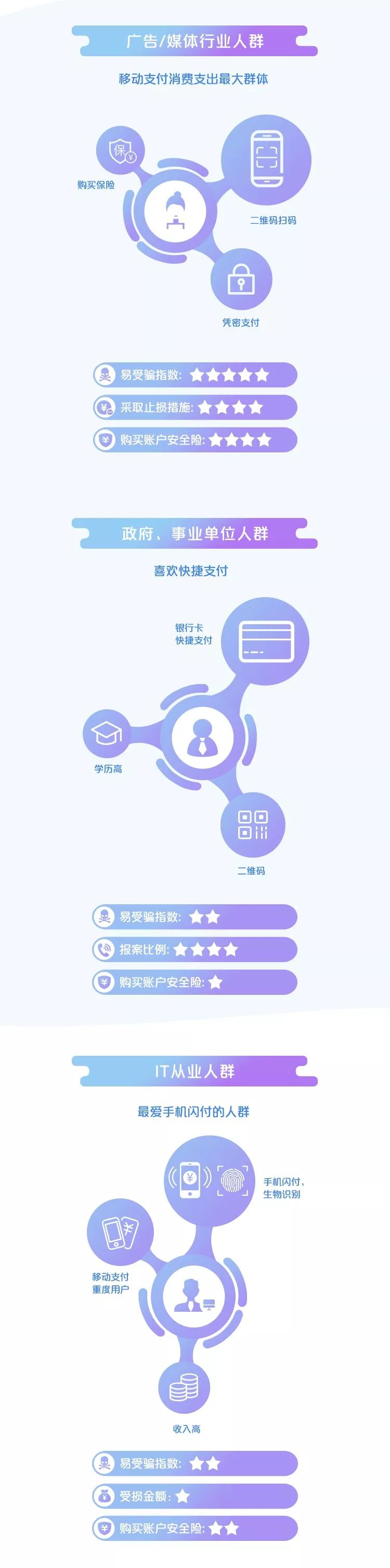 今年以来,国家实施了一系列普惠金融和减税降费的政策,有效刺激公众消费购买力,促进移动经济的稳步增长。调查数据显示,创业、IT、房地产等行业人群的人均月可支配收入金额位居前三。从移动支付消费金额看,创业者的移动支付消费金额领跑其他行业群体,超过3000元/月,全职主妇的移动支付消费月均支出达2863元,名列第三;从移动支付使用频次来看,IT行业群体使用频次最高;从移动支付消费金额占比来看,学生群体移动消费的支出占超过月可支配收入的4成,移动支付已经成为该群体主要支付工具。