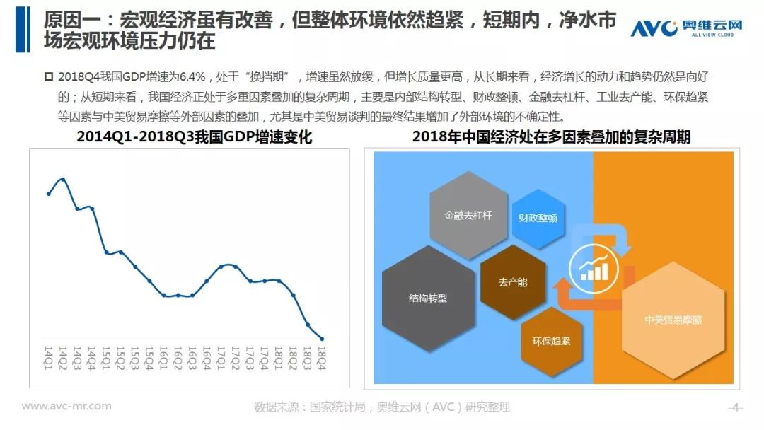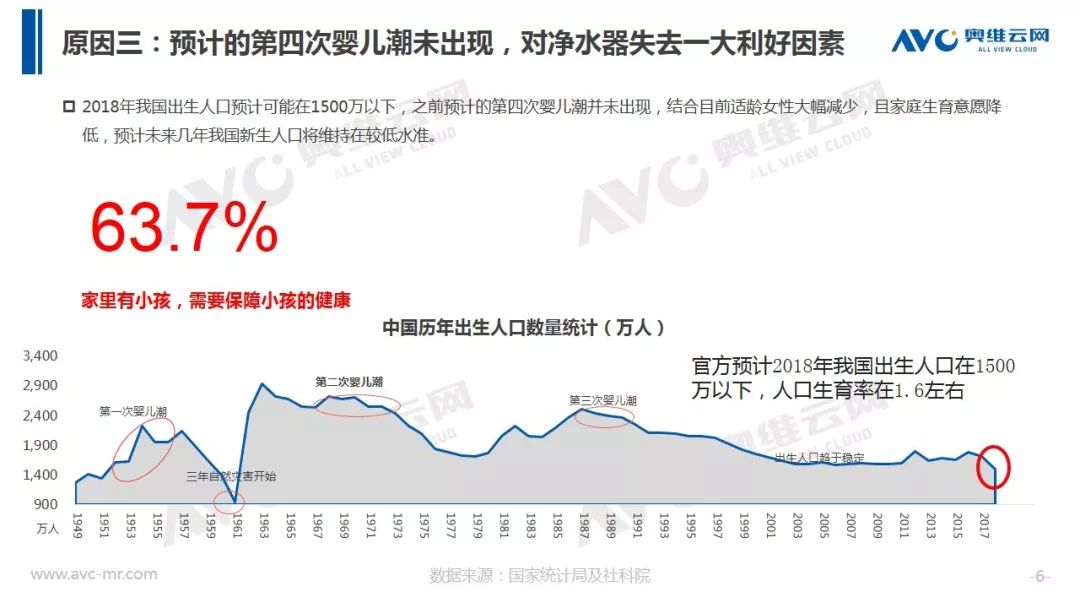 2018年受外部环境及上下游影响,净水器市场增涨通道收窄,行业开始进入红海竞争。2018年全国经济虽有改善但整体趋紧,与净水产业紧密相关的房地产市场短期依旧难以改善,同时装潢市场增速放缓,另前期预计出现的第四次婴儿潮难产,这些因素在外部环境方面对净水器增长形成制约。在行业内部一二级市场伴随前期净水器普及,市场已得以释放,目前三四级市场开拓需要时间对市场进行培育,而在产业上游伴随前几年投资过热、产品同质化及日渐趋紧的监管,净水器市场增速开始换挡。