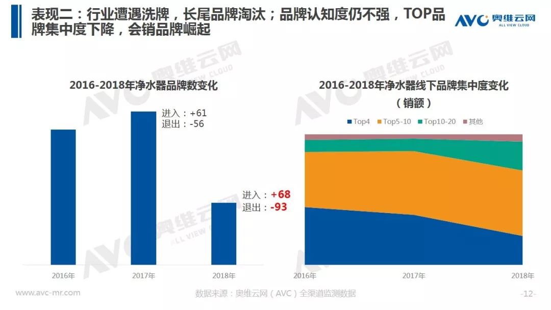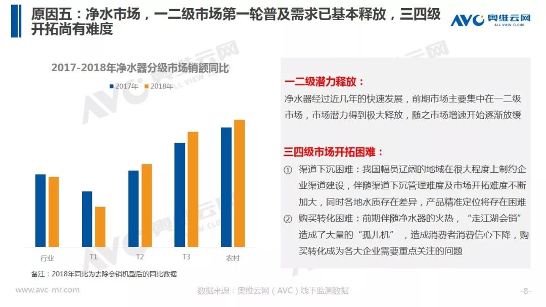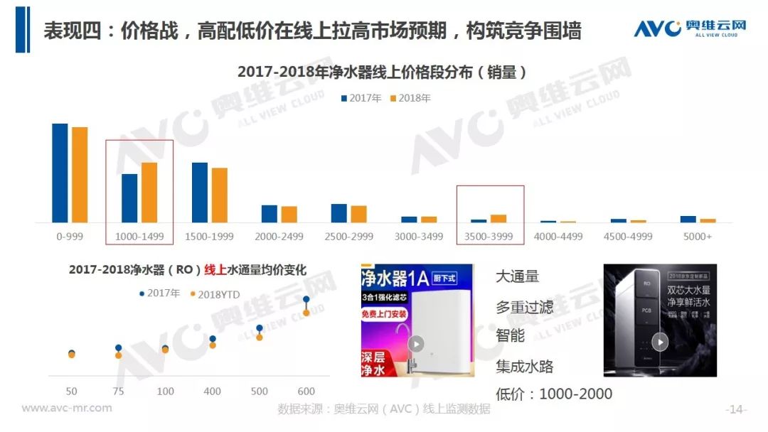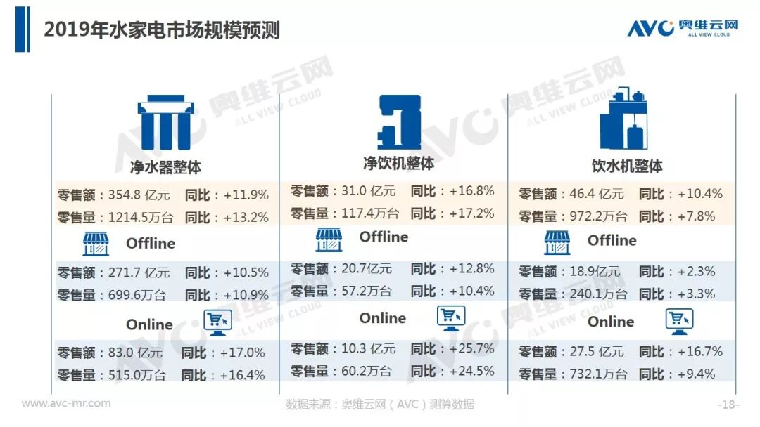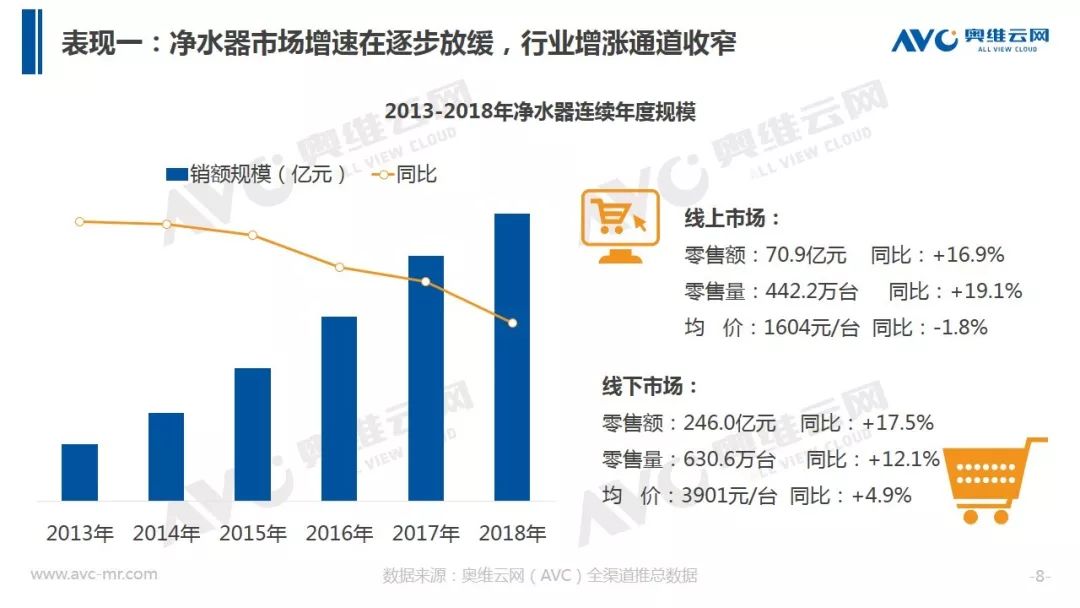 据奥维云网(AVC)全渠道推总数据显示,2018年净水器全年销额规模316.9亿元,同比增速17.4%,较2017年增速下滑15.5个百分点。在品牌方面,大量长尾品牌被清洗出局,同时TOP品牌集中度出现下滑。在价格层面整体均价冲高回落,在线下,企业重启会销争夺份额,而在线上,企业通过高配低价产品构筑竞争围墙,行业竞争开始热化。