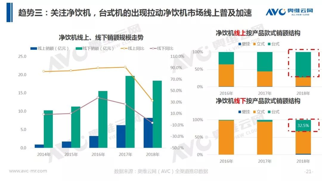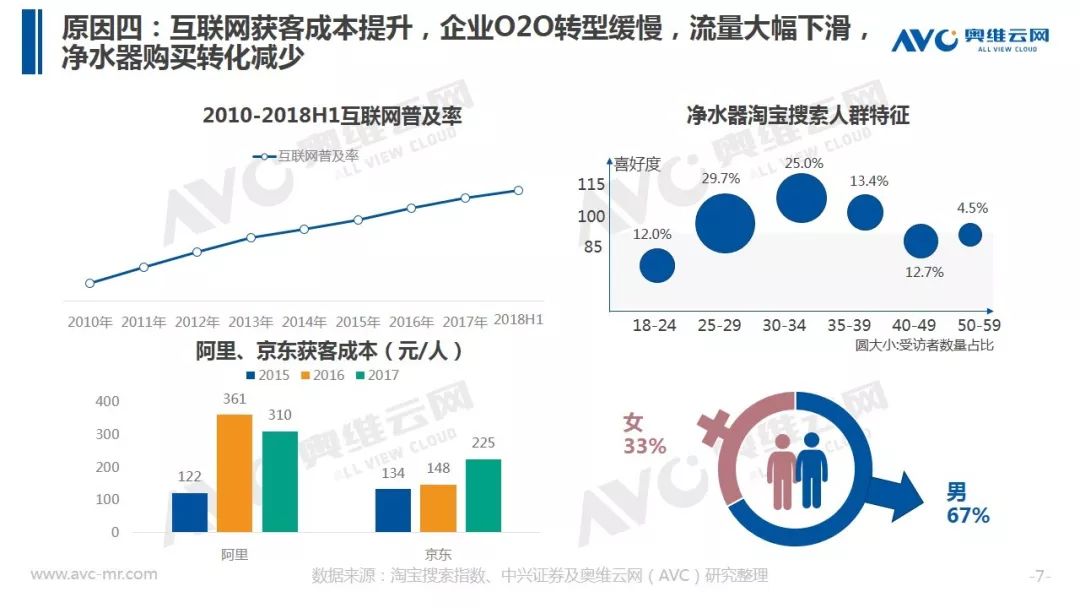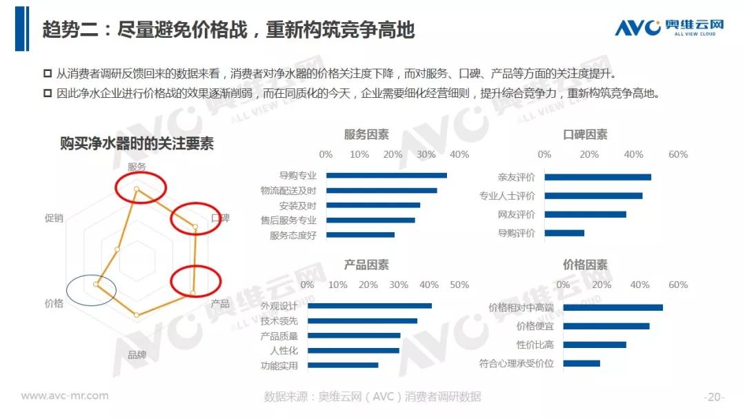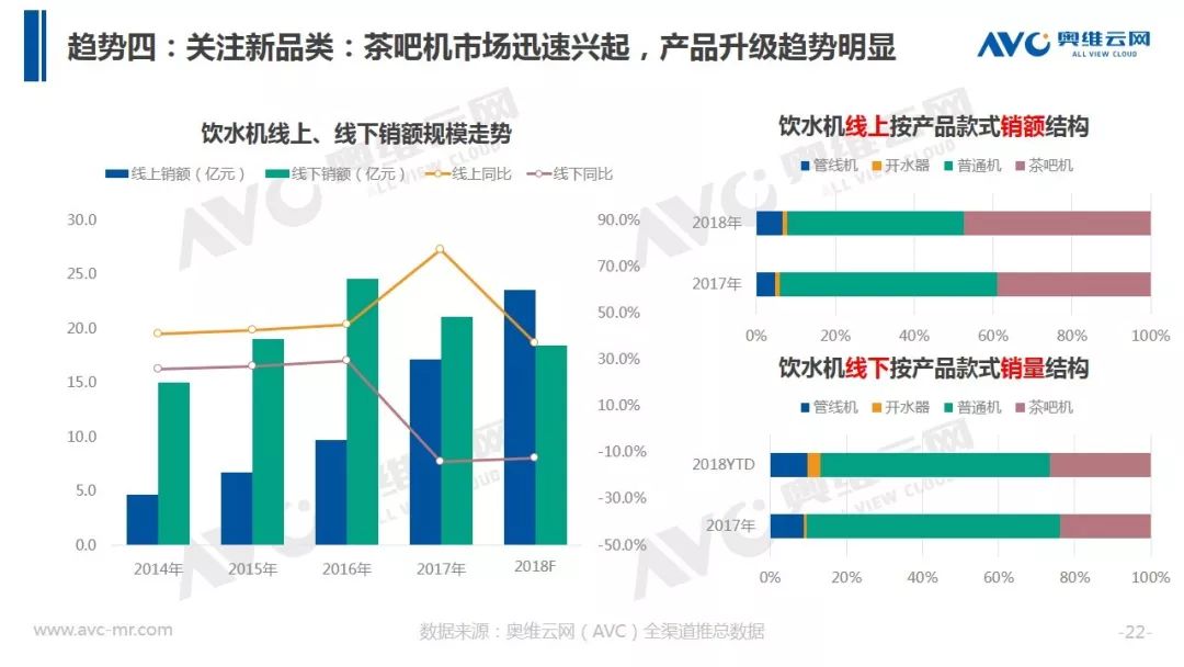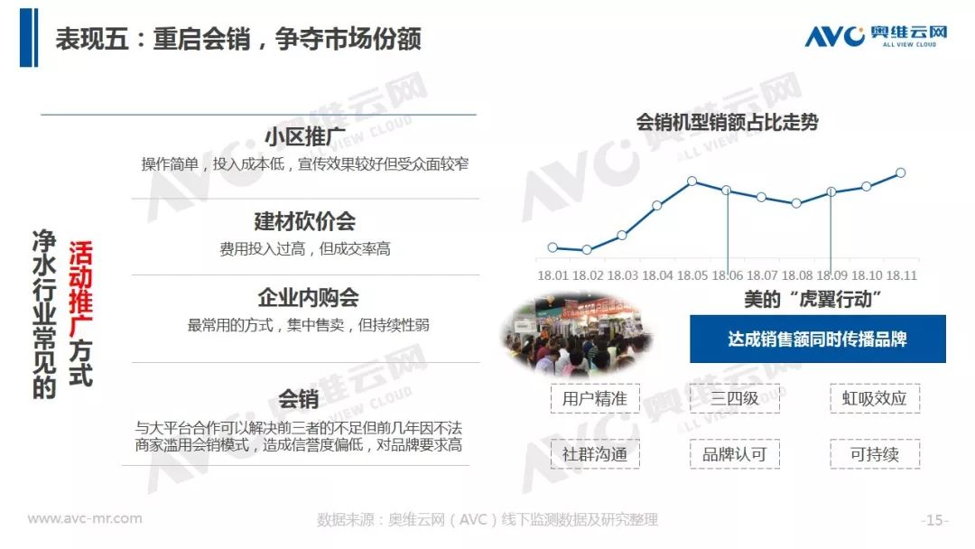 据奥维云网(AVC)全渠道推总数据显示,2018年净水器全年销额规模316.9亿元,同比增速17.4%,较2017年增速下滑15.5个百分点。在品牌方面,大量长尾品牌被清洗出局,同时TOP品牌集中度出现下滑。在价格层面整体均价冲高回落,在线下,企业重启会销争夺份额,而在线上,企业通过高配低价产品构筑竞争围墙,行业竞争开始热化。