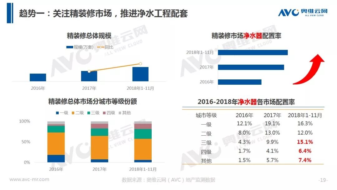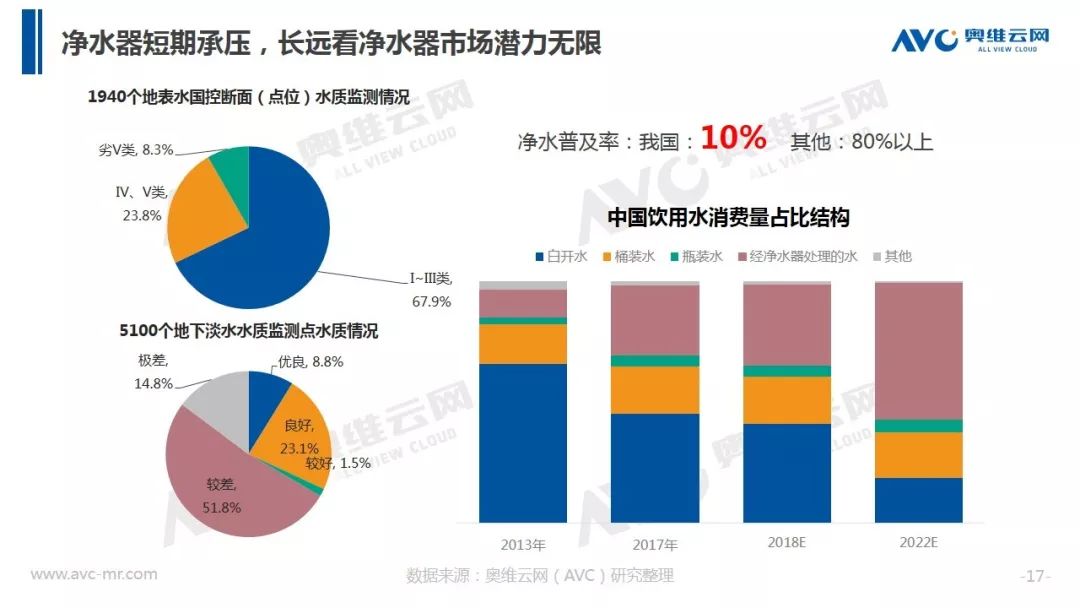 我国存在的水污染问题及消费者对健康饮水的需求矛盾长期存在,而在我国目前净水类产品普及比例依然相对较低,因此市场前景依然广阔,据奥维云网(AVC)测算显示,2019年净水器市场规模将达到354.8亿元。对于企业来讲需要在潜力区域、精装市场、服务售后及新品类等方面加大关注。